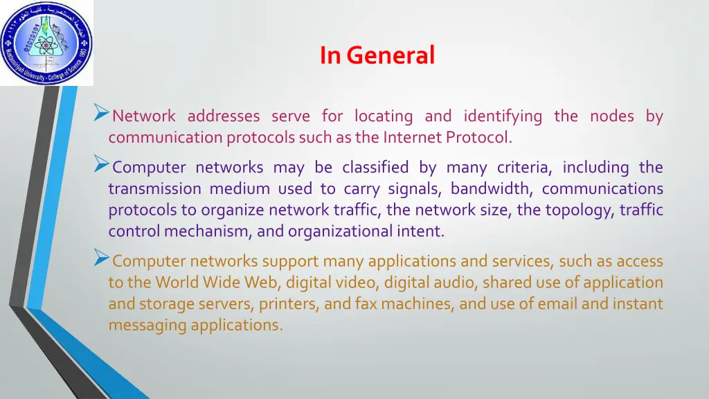 In General Network addresses serve for locating and identifying the nodes by communicationprotocolssuchasthe Internet Protocol. Computer networks may be classified by many criteria, including the transmission medium used to carry signals, bandwidth, communications protocols to organize network traffic, the network size, the topology, traffic controlmechanism, andorganizational intent. Computer networks support many applications and services, such as access to theWorldWideWeb, digital video, digitalaudio, shareduseofapplication andstorage servers, printers, andfaxmachines, anduse ofemailand instant messaging applications.