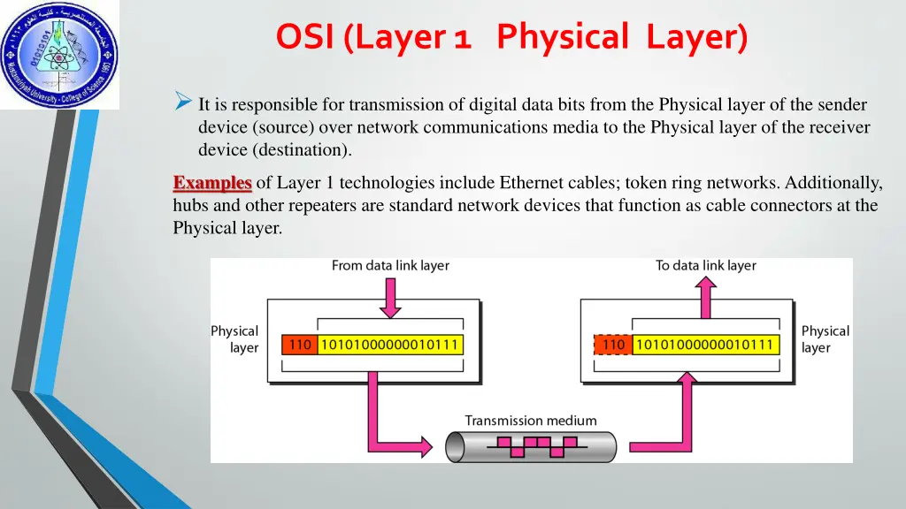 OSI (Layer 1 Physical Layer) It is responsible for transmission of digital data bits from the Physical layer of the sender device (source) over network communications media to the Physical layer of the receiver device (destination). Examples of Layer 1 technologies include Ethernet cables; token ring networks. Additionally, hubs and other repeaters are standard network devices that function as cable connectors at the Physical layer.
