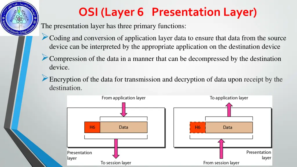 OSI (Layer 6 Presentation Layer) The presentation layer has three primary functions: Coding and conversion of application layer data to ensure that data from the source device can be interpreted by the appropriate application on the destination device Compression of the data in a manner that can be decompressed by the destination device. Encryption of the data for transmission and decryption of data upon receipt by the destination.