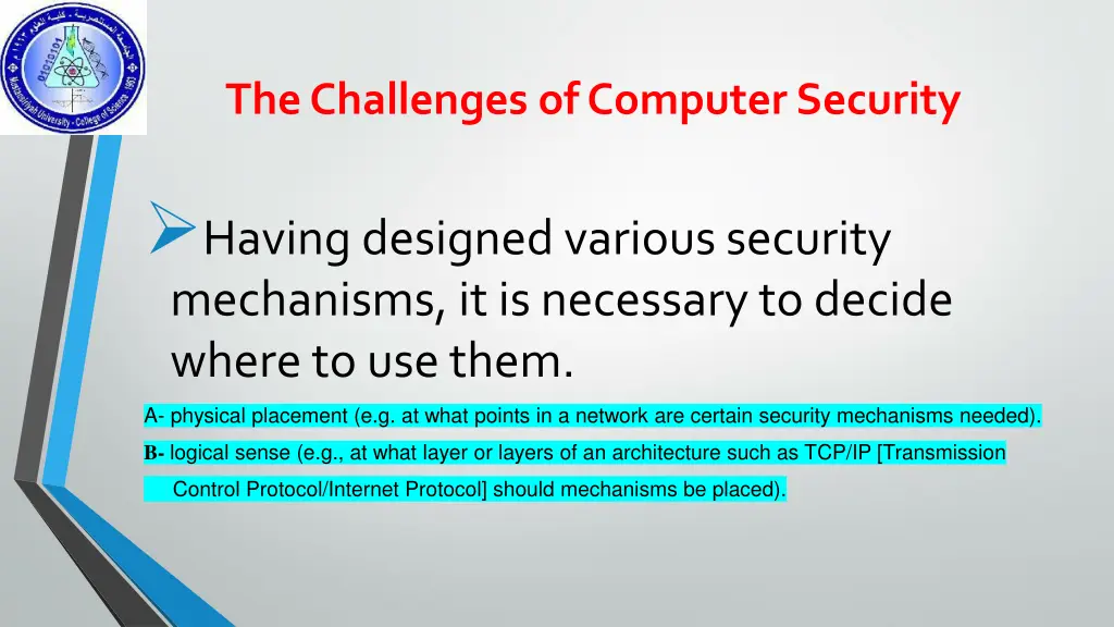 The Challenges of Computer Security Having designed various security mechanisms, it is necessary to decide where to use them. A- physical placement (e.g. at what points in a network are certain security mechanisms needed). B- logical sense (e.g., at what layer or layers of an architecture such as TCP/IP [Transmission Control Protocol/Internet Protocol] should mechanisms be placed).