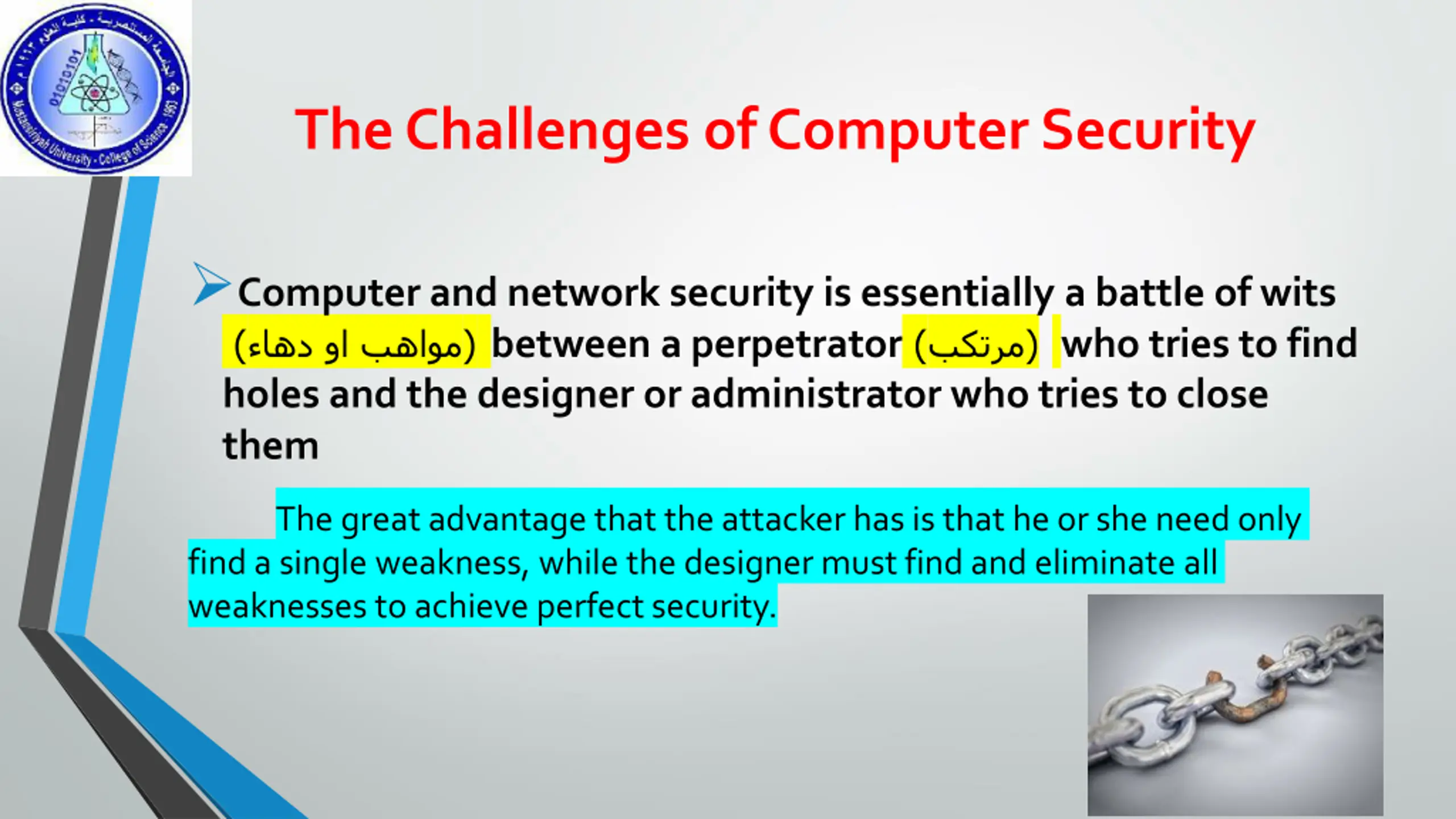 The Challenges of Computer Security Computer and network security is essentially a battle of wits ( ) between a perpetrator holes and the designer or administrator who tries to close them ) ( who tries to find The great advantage that the attacker has is that he or she need only find a single weakness, while the designer must find and eliminate all weaknesses to achieve perfect security.