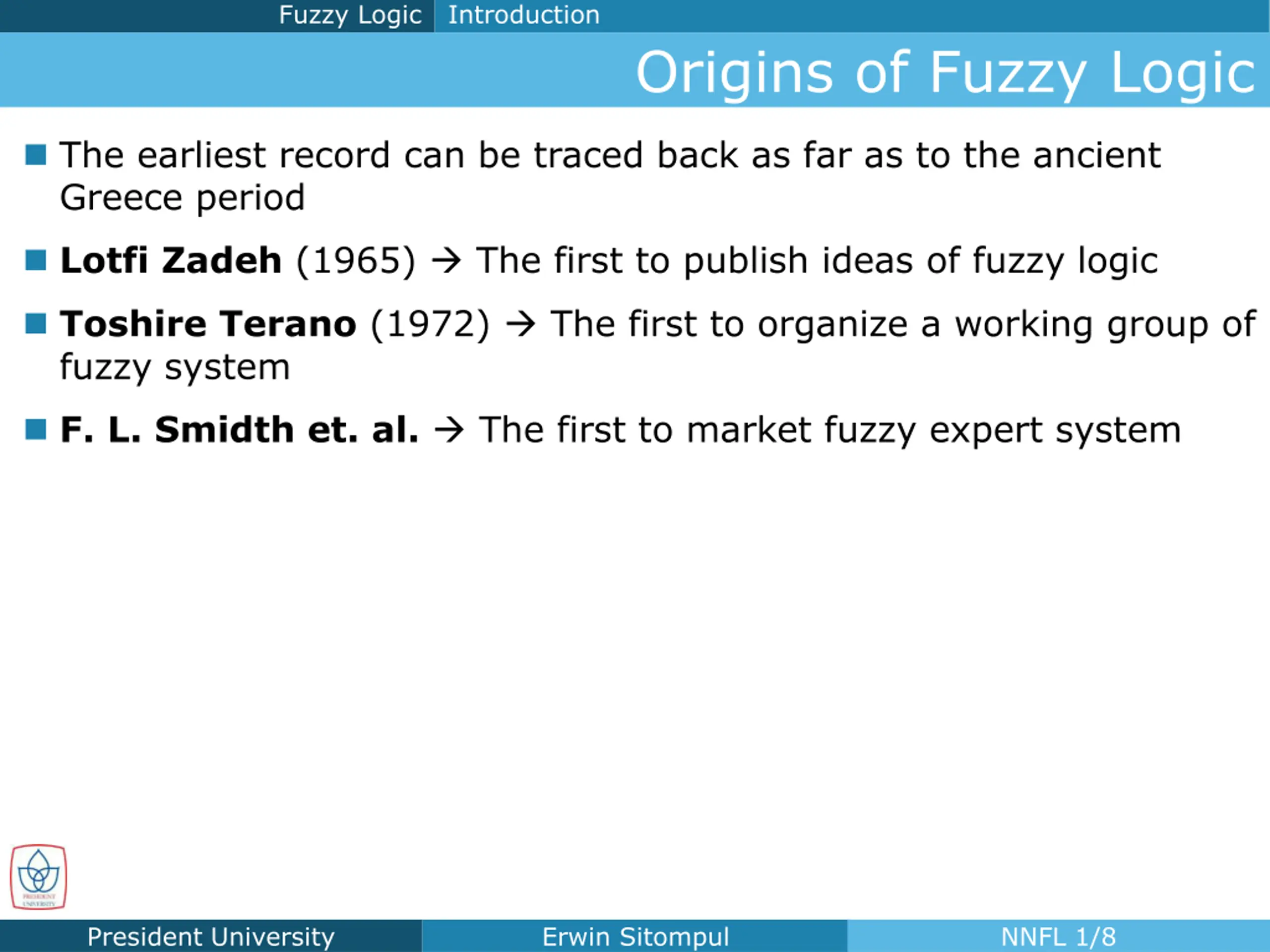 Fuzzy Logic Introduction Origins of Fuzzy Logic The earliest record can be traced back as far as to the ancient Greece period Lotfi Zadeh (1965) The first to publish ideas of fuzzy logic Toshire Terano (1972) The first to organize a working group of fuzzy system F. L. Smidth et. al. The first to market fuzzy expert system President University Erwin Sitompul NNFL 1/8