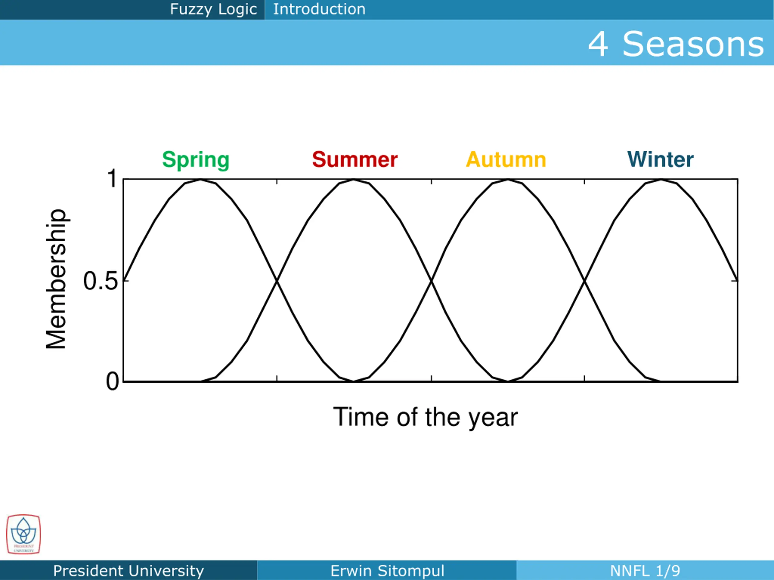 Fuzzy Logic Introduction 4 Seasons Spring Summer Autumn Winter 1 Membership 0.5 0 Time of the year President University Erwin Sitompul NNFL 1/9