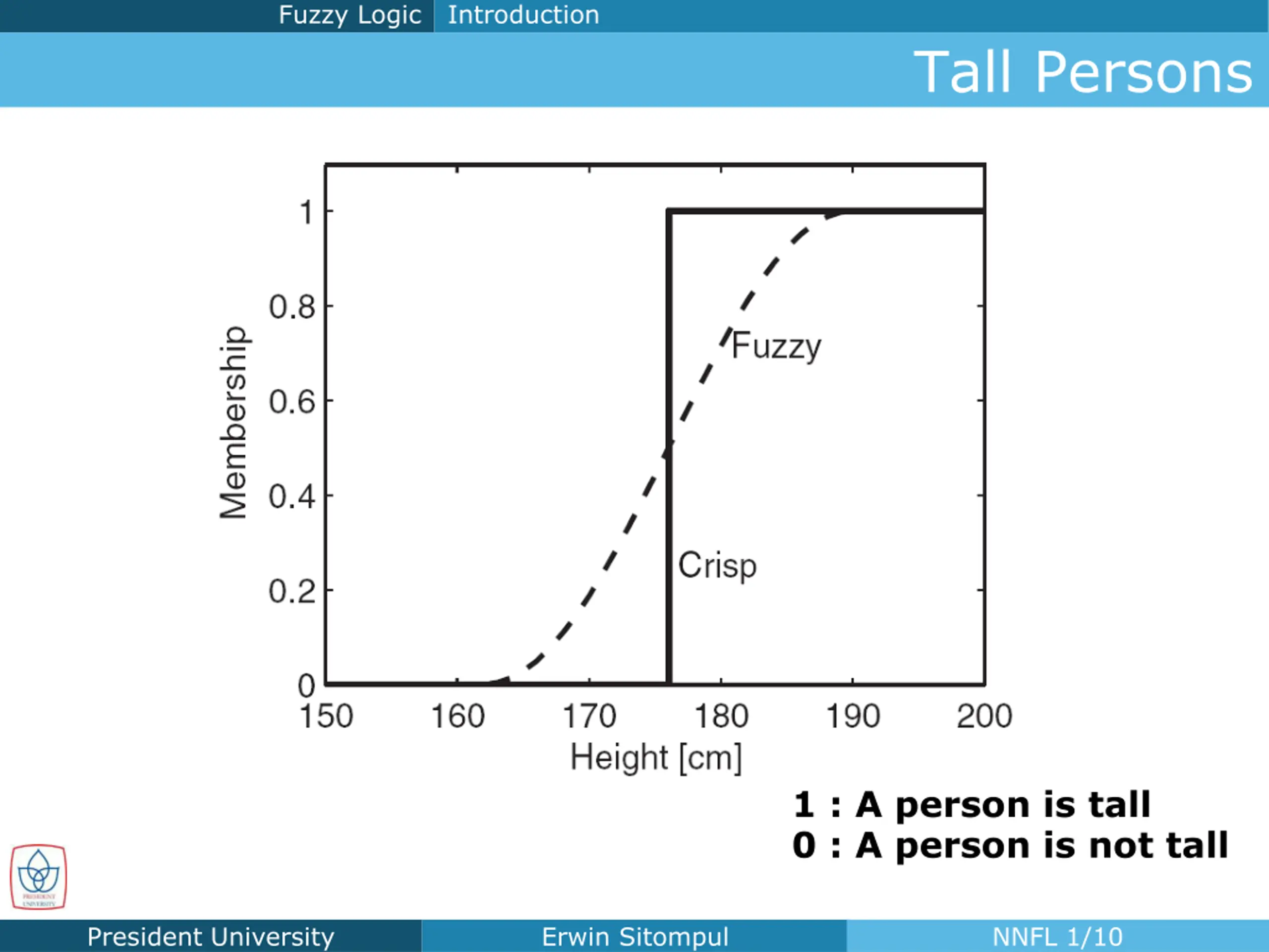 Fuzzy Logic Introduction Tall Persons 1 : A person is tall 0 : A person is not tall President University Erwin Sitompul NNFL 1/10