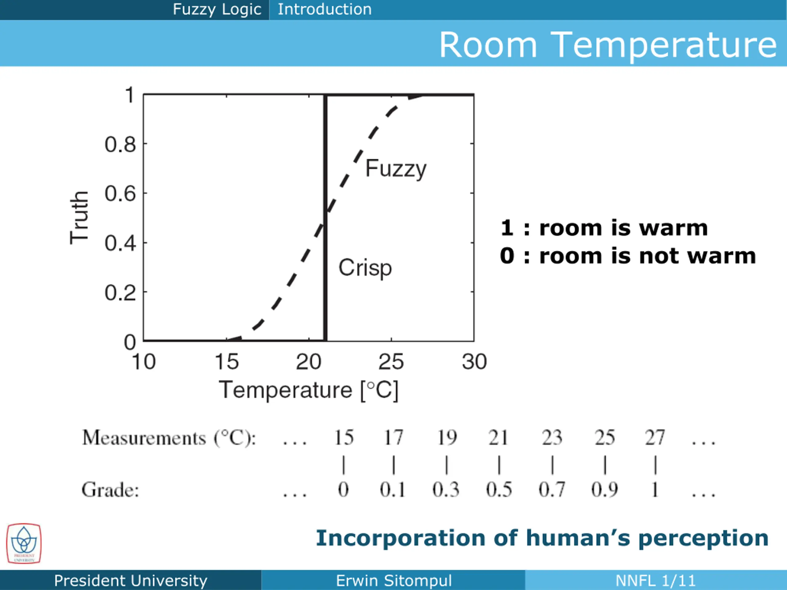 Fuzzy Logic Introduction Room Temperature 1 : room is warm 0 : room is not warm Incorporation of human s perception President University Erwin Sitompul NNFL 1/11
