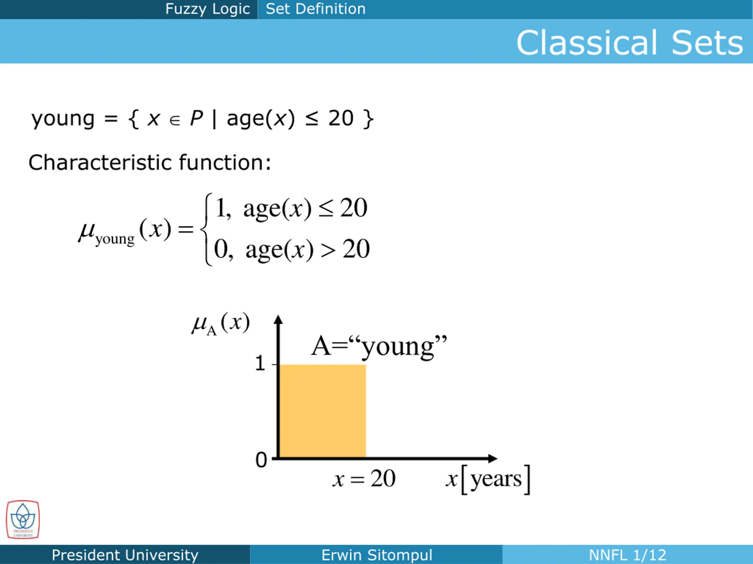 Fuzzy Logic Set Definition Classical Sets young = { x P | age(x) 20 } Characteristic function: 1, age( ) 0, age( ) 20 20 x x young = ( ) x A( ) x A= young 1 0 x = years x 20 President University Erwin Sitompul NNFL 1/12