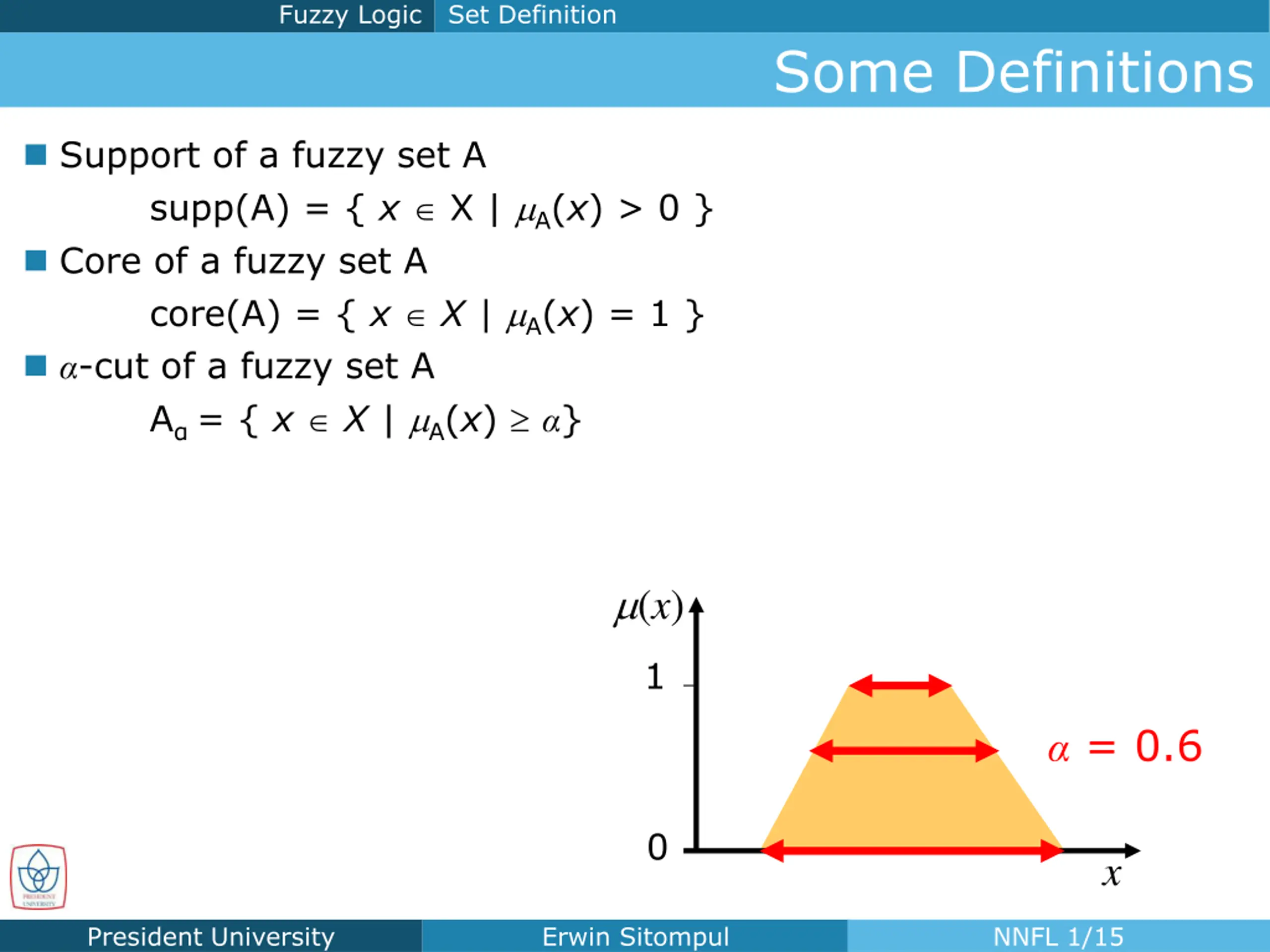 Fuzzy Logic Set Definition Some Definitions Support of a fuzzy set A supp(A) = { x X | A(x) > 0 } Core of a fuzzy set A core(A) = { x X | A(x) = 1 } -cut of a fuzzy set A A = { x X | A(x) } (x) 1 = 0.6 0 x President University Erwin Sitompul NNFL 1/15