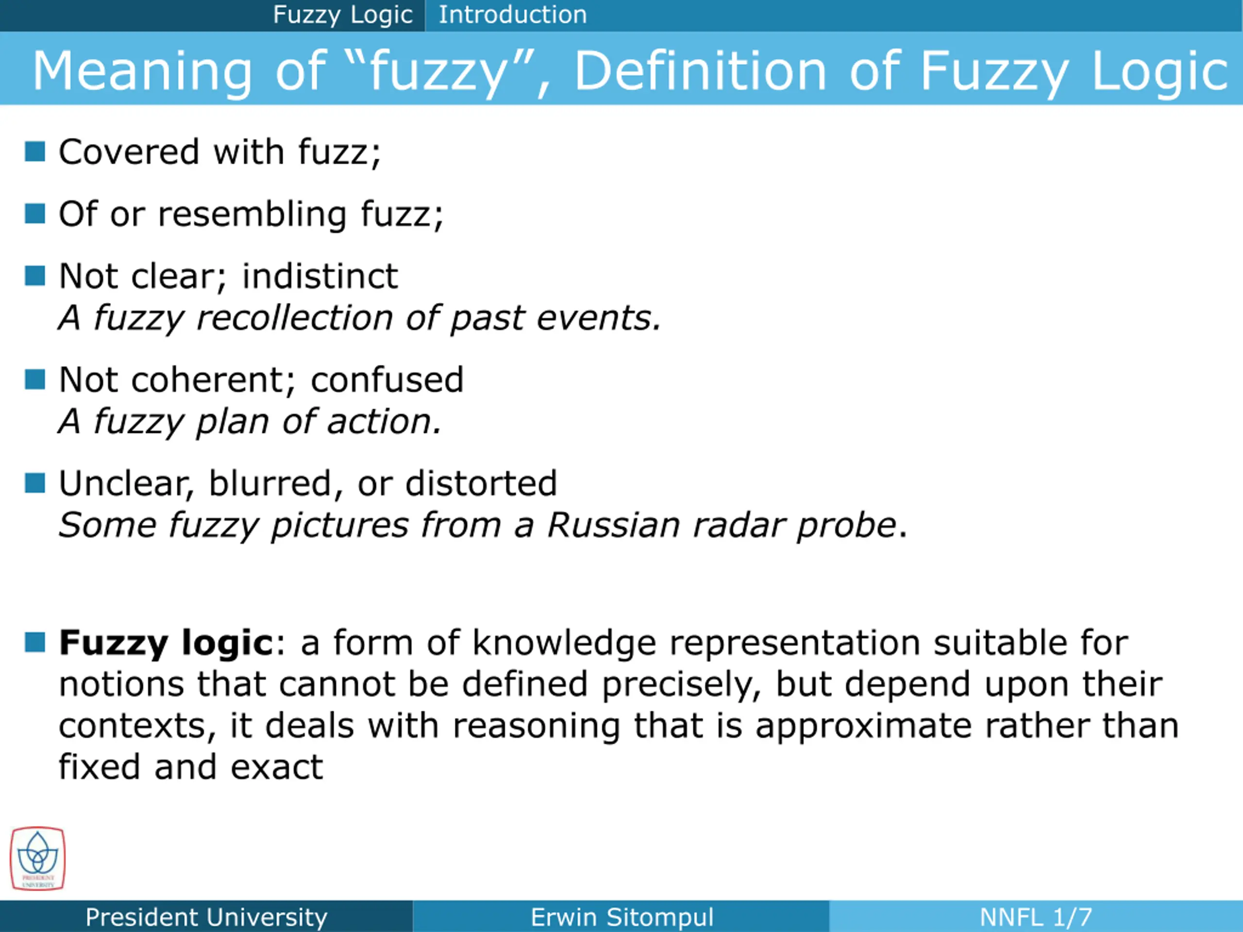 Fuzzy Logic Introduction Meaning of fuzzy , Definition of Fuzzy Logic Covered with fuzz; Of or resembling fuzz; Not clear; indistinct A fuzzy recollection of past events. Not coherent; confused A fuzzy plan of action. Unclear, blurred, or distorted Some fuzzy pictures from a Russian radar probe. Fuzzy logic: a form of knowledge representation suitable for notions that cannot be defined precisely, but depend upon their contexts, it deals with reasoning that is approximate rather than fixed and exact. President University Erwin Sitompul NNFL 1/7