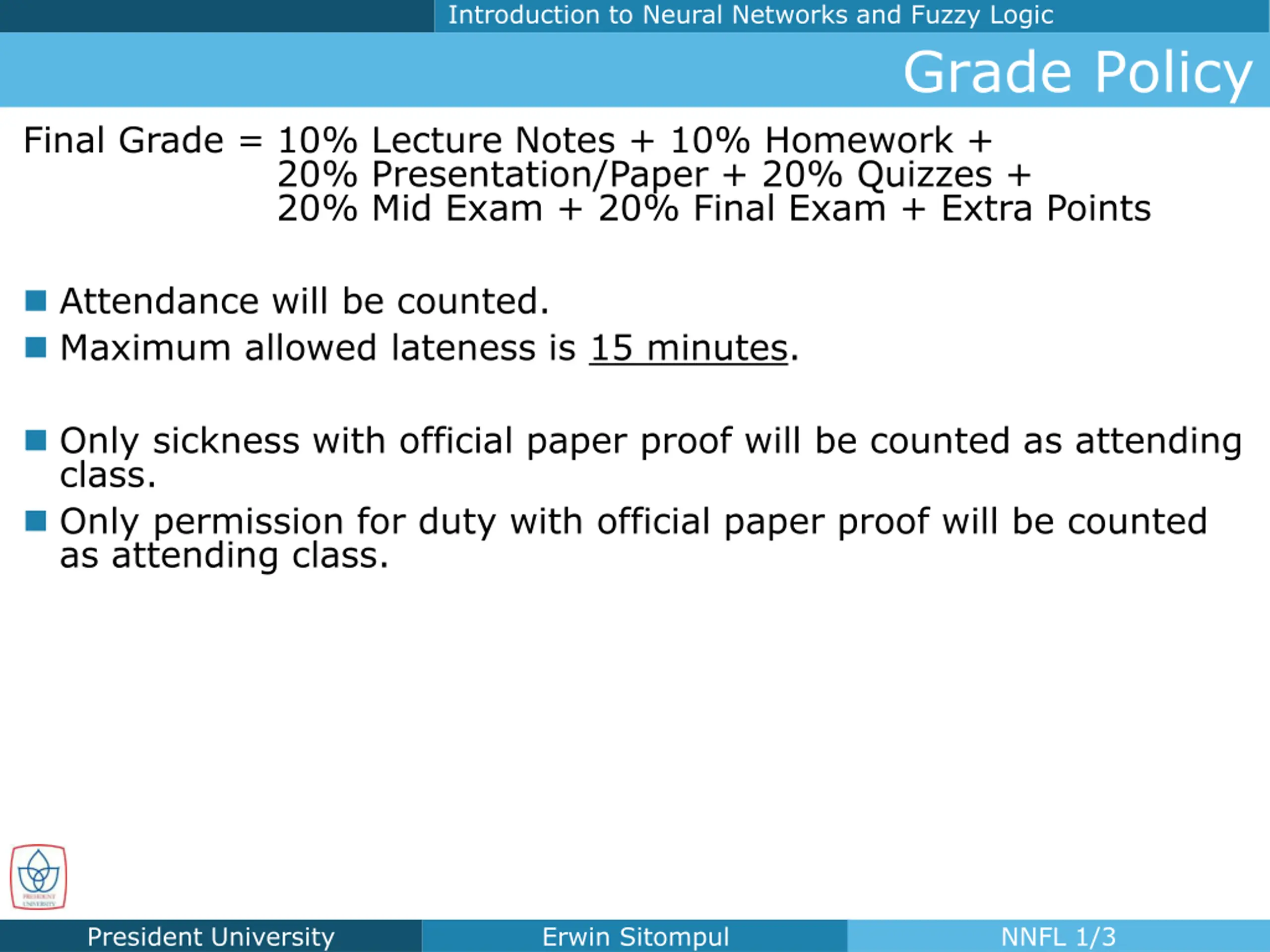 Introduction to Neural Networks and Fuzzy Logic Grade Policy Final Grade = 10% Lecture Notes + 10% Homework + 20% Presentation/Paper + 20% Quizzes + 20% Mid Exam + 20% Final Exam + Extra Points Attendance will be counted. Maximum allowed lateness is 15 minutes. Only sickness with official paper proof will be counted as attending class. Only permission for duty with official paper proof will be counted as attending class. President University Erwin Sitompul NNFL 1/3