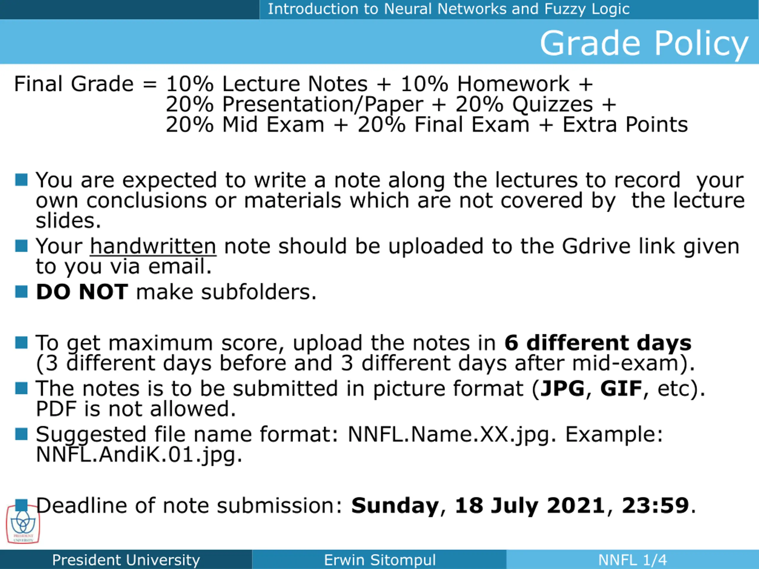 Introduction to Neural Networks and Fuzzy Logic Grade Policy Final Grade = 10% Lecture Notes + 10% Homework + 20% Presentation/Paper + 20% Quizzes + 20% Mid Exam + 20% Final Exam + Extra Points You are expected to write a note along the lectures to record your own conclusions or materials which are not covered by the lecture slides. Your handwritten note should be uploaded to the Gdrive link given to you via email. DO NOT make subfolders. To get maximum score, upload the notes in 6 different days (3 different days before and 3 different days after mid-exam). The notes is to be submitted in picture format (JPG, GIF, etc). PDF is not allowed. Suggested file name format: NNFL.Name.XX.jpg. Example: NNFL.AndiK.01.jpg. Deadline of note submission: Sunday, 18 July 2021, 23:59. President University Erwin Sitompul NNFL 1/4