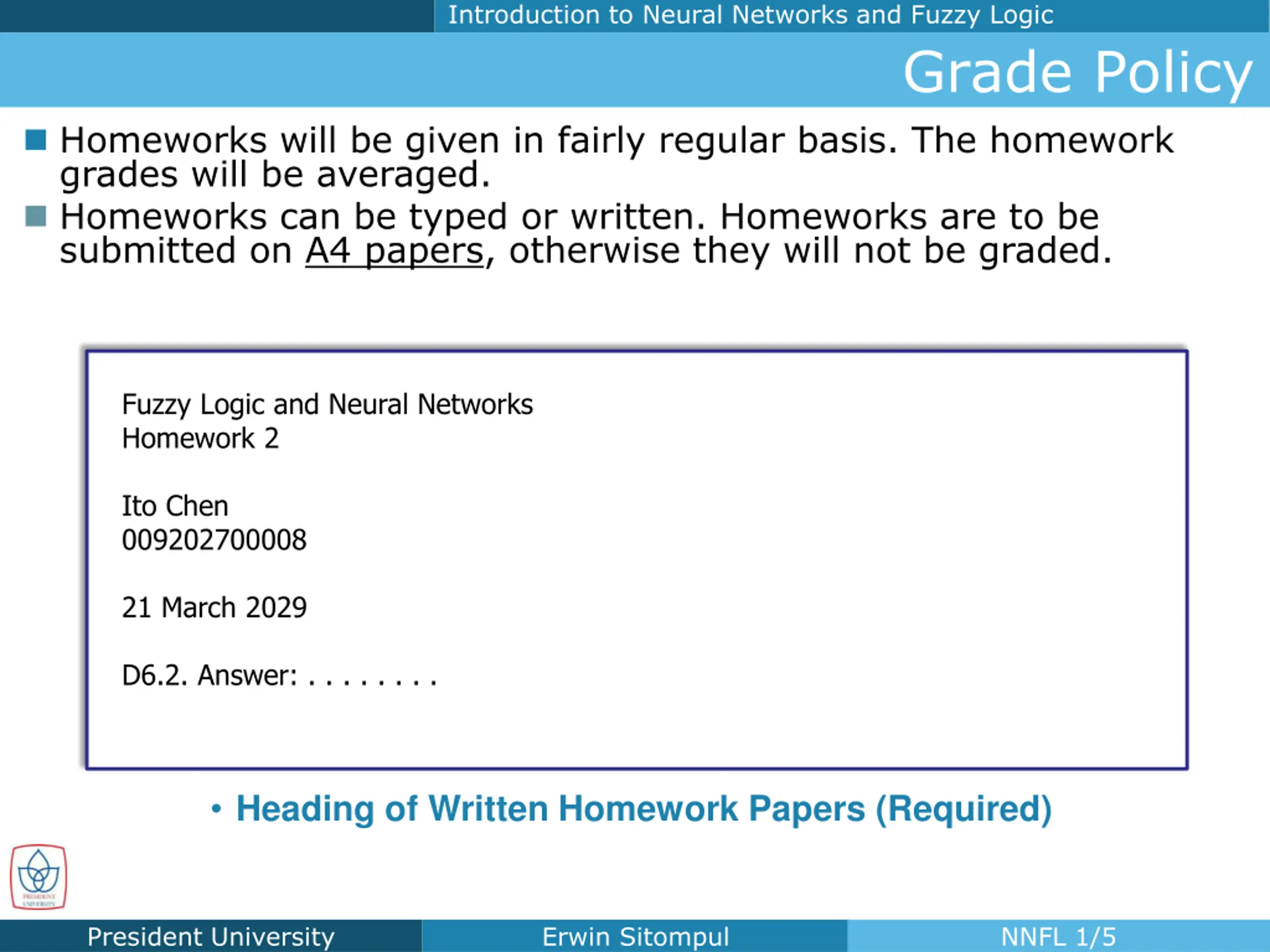Introduction to Neural Networks and Fuzzy Logic Grade Policy Homeworks will be given in fairly regular basis. The homework grades will be averaged. Homeworks can be typed or written. Homeworks are to be submitted on A4 papers, otherwise they will not be graded. Fuzzy Logic and Neural Networks Homework 2 Ito Chen 009202700008 21 March 2029 D6.2. Answer: . . . . . . . . Heading of Written Homework Papers (Required) President University Erwin Sitompul NNFL 1/5