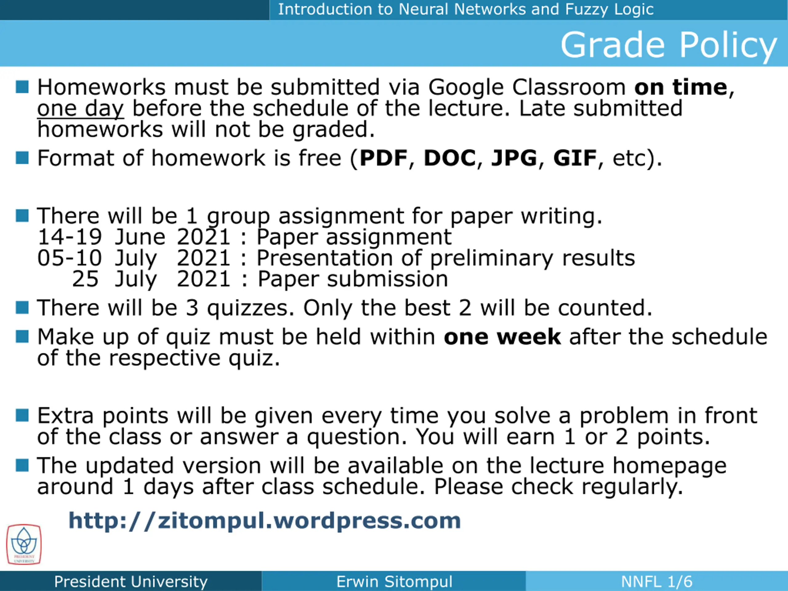 Introduction to Neural Networks and Fuzzy Logic Grade Policy Homeworks must be submitted via Google Classroom on time, one day before the schedule of the lecture. Late submitted homeworks will not be graded. Format of homework is free (PDF, DOC, JPG, GIF, etc). There will be 1 group assignment for paper writing. 14-19 June 2021 : Paper assignment 05-10 July 2021 : Presentation of preliminary results 25 July 2021 : Paper submission There will be 3 quizzes. Only the best 2 will be counted. Make up of quiz must be held within one week after the schedule of the respective quiz. Extra points will be given every time you solve a problem in front of the class or answer a question. You will earn 1 or 2 points. The updated version will be available on the lecture homepage around 1 days after class schedule. Please check regularly. http://zitompul.wordpress.com President University Erwin Sitompul NNFL 1/6