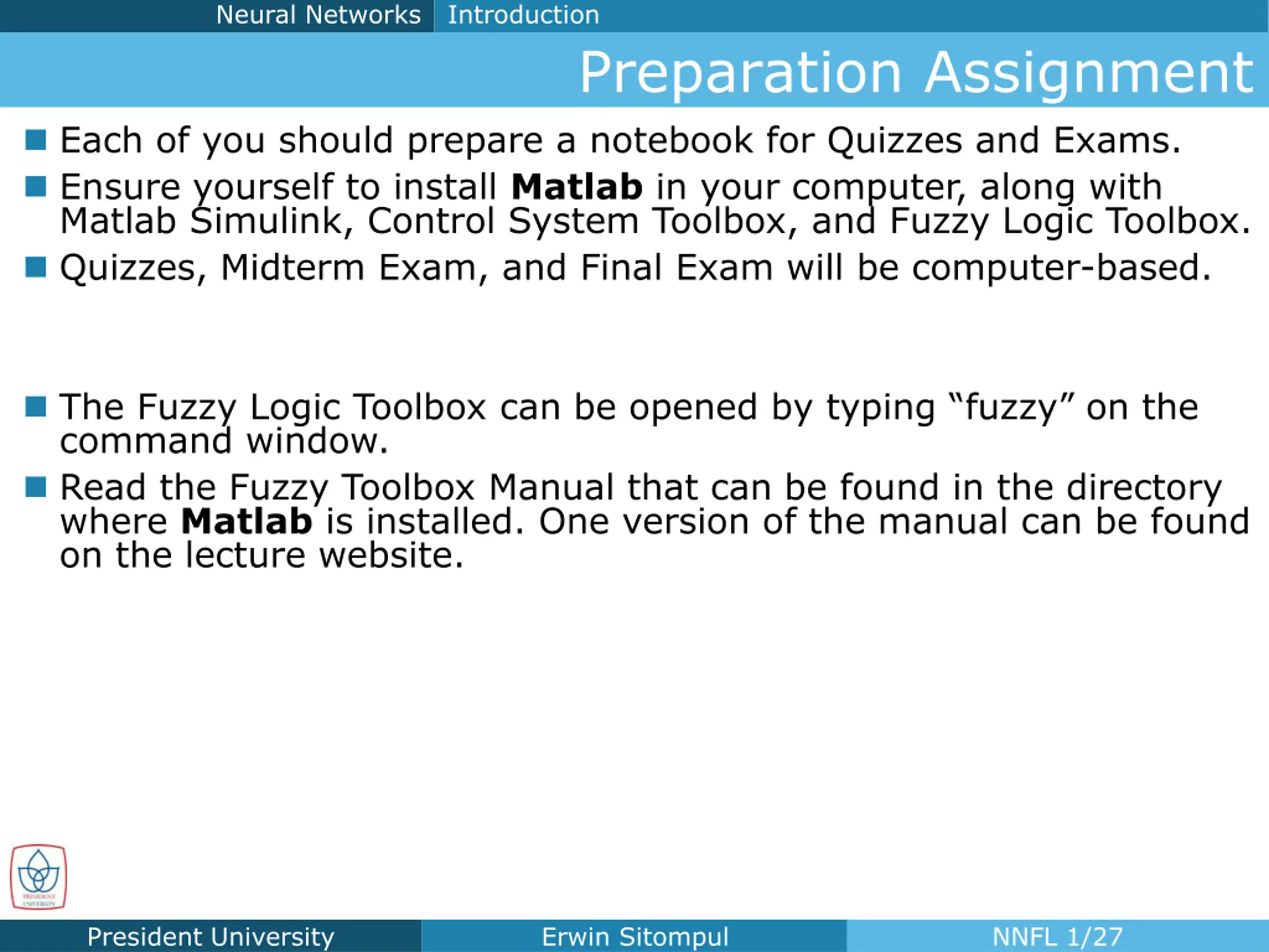 Neural Networks Introduction Preparation Assignment Each of you should prepare a notebook for Quizzes and Exams. Ensure yourself to install Matlab in your computer, along with Matlab Simulink, Control System Toolbox, and Fuzzy Logic Toolbox. Quizzes, Midterm Exam, and Final Exam will be computer-based. The Fuzzy Logic Toolbox can be opened by typing fuzzy on the command window. Read the Fuzzy Toolbox Manual that can be found in the directory where Matlab is installed. One version of the manual can be found on the lecture website. President University Erwin Sitompul NNFL 1/27