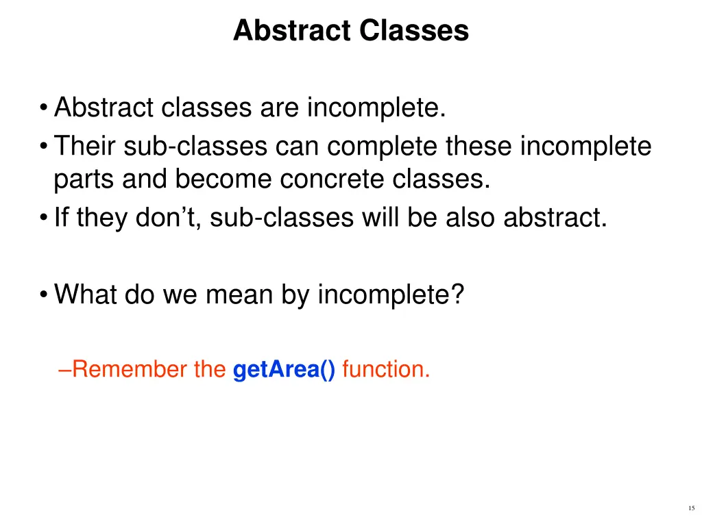 Abstract Classes Abstract classes are incomplete. Their sub-classes can complete these incomplete parts and become concrete classes. If they don t, sub-classes will be also abstract. What do we mean by incomplete? Remember the getArea() function. 15