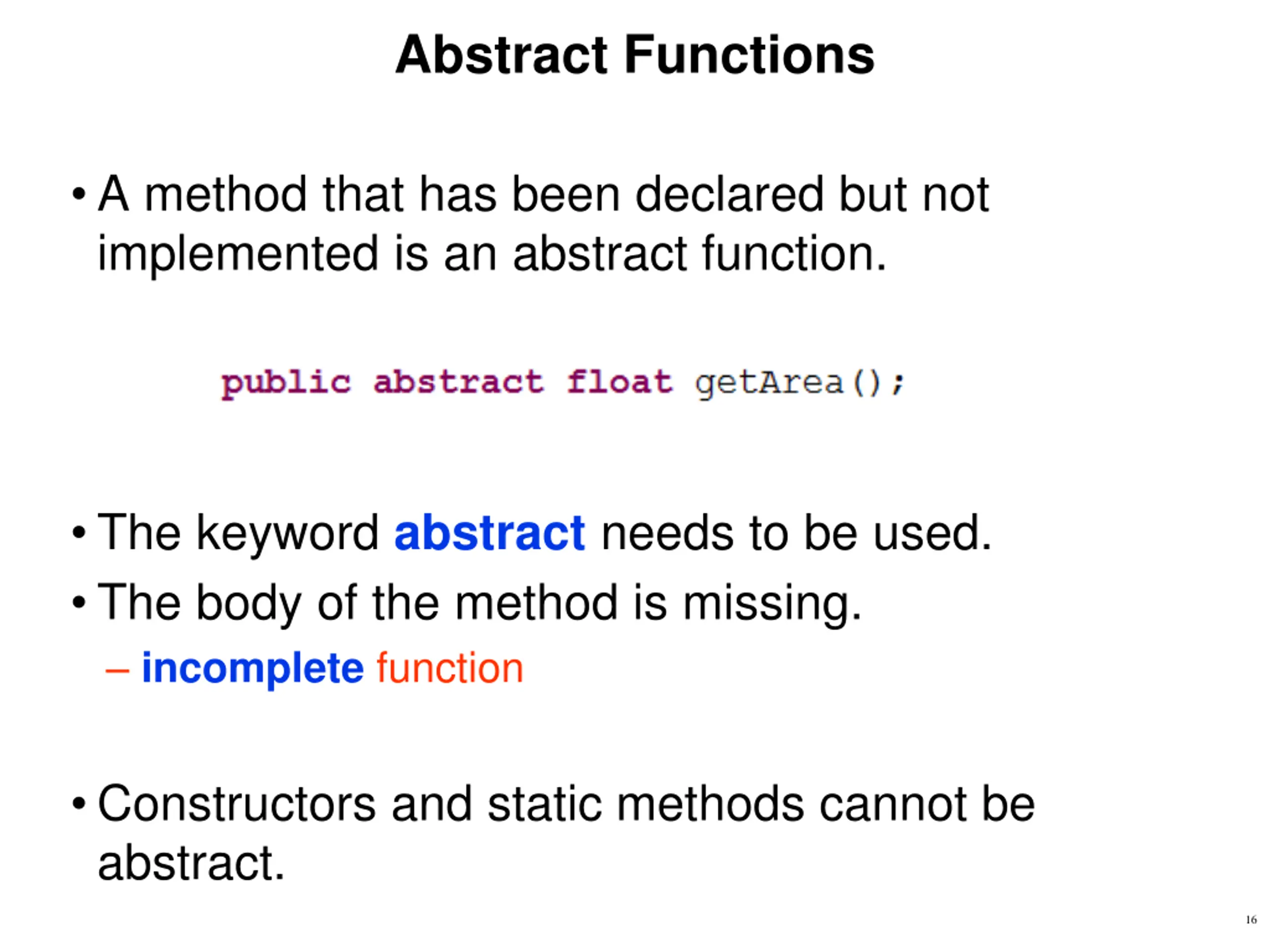 Abstract Functions A method that has been declared but not implemented is an abstract function. The keyword abstract needs to be used. The body of the method is missing. incomplete function Constructors and static methods cannot be abstract. 16