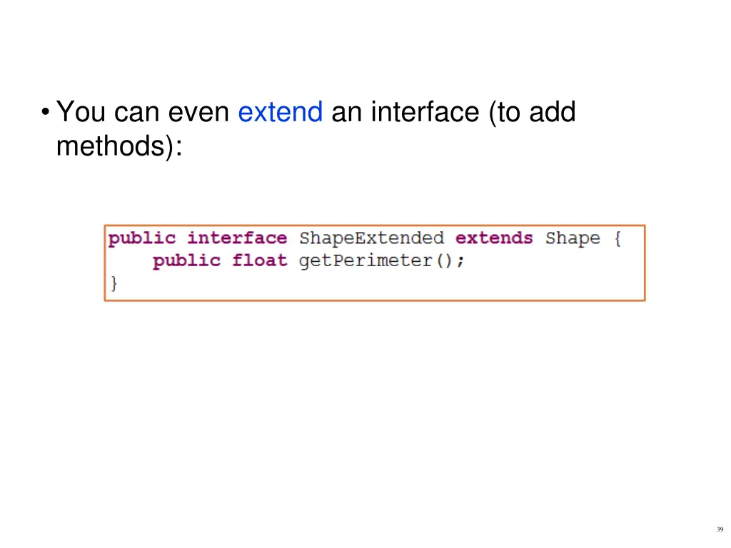 Interface You can even extend an interface (to add methods): interface KeyListener { public void keyPressed(KeyEvent e); public void keyReleased(KeyEvent e); public void keyTyped(KeyEvent e); } interface FunkyKeyListener extends KeyListener { public void funkykeyEvent(KeyEvent e); } 40