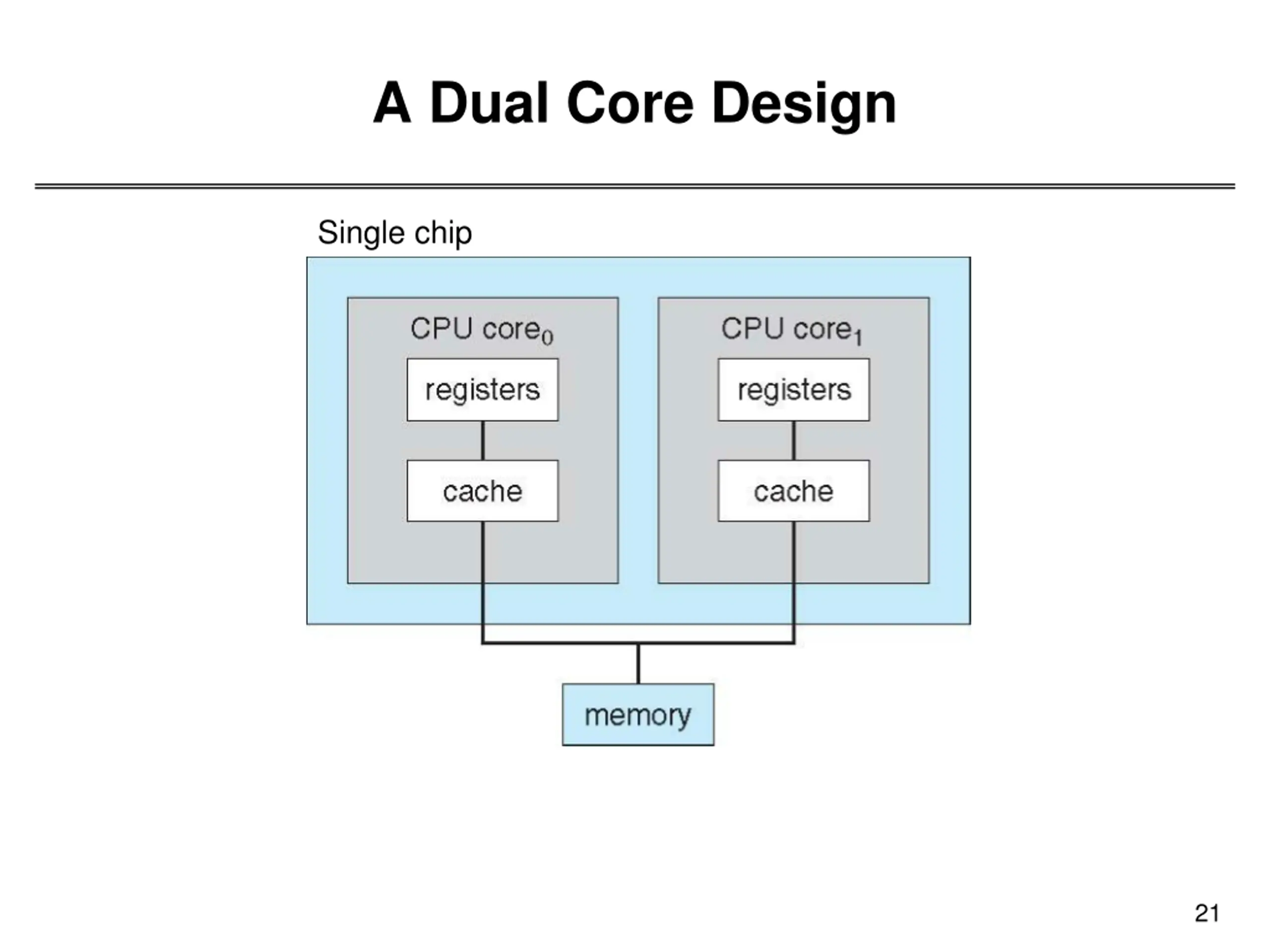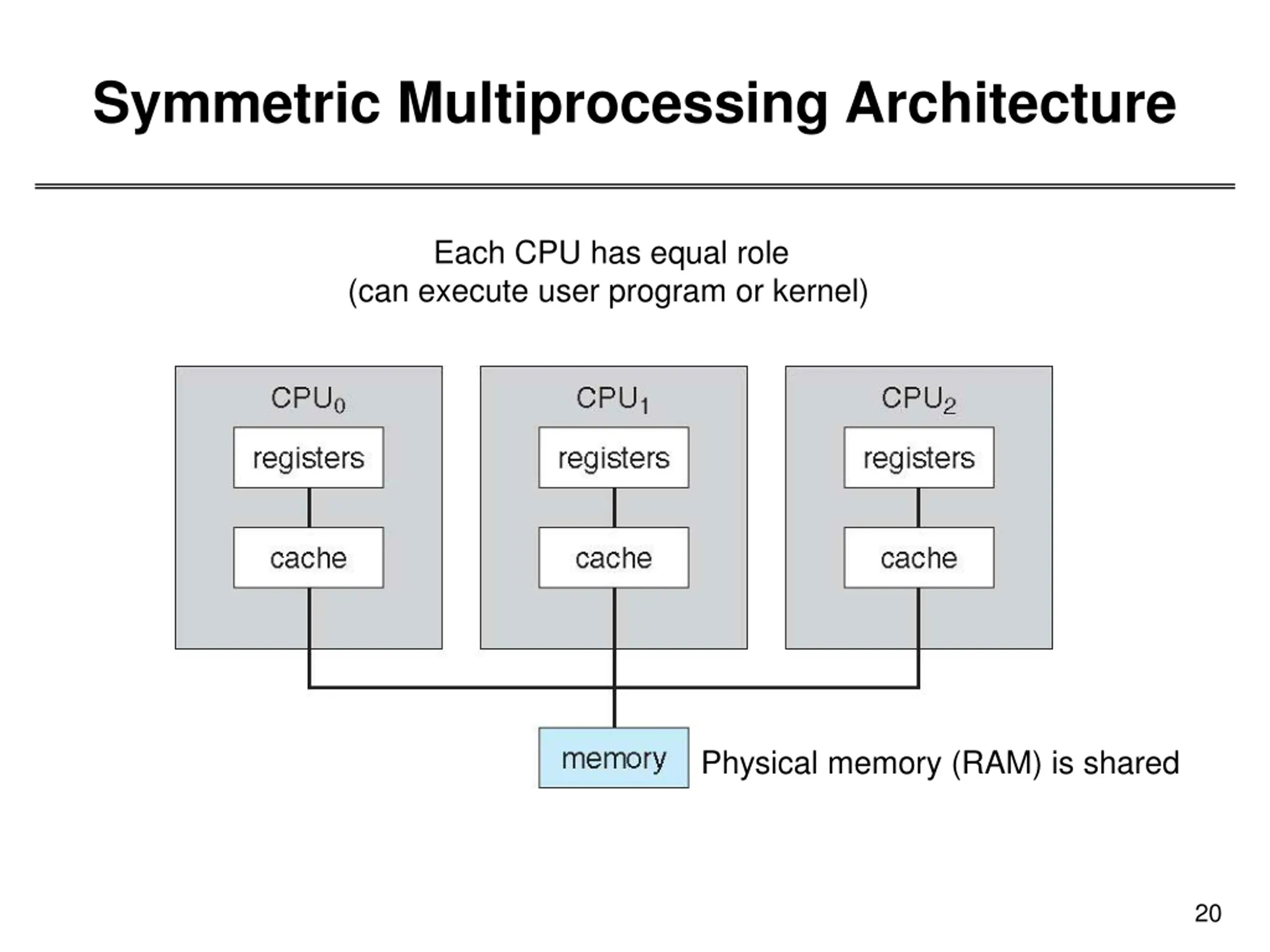 Symmetric Multiprocessing Architecture Each CPU has equal role (can execute user program or kernel) Physical memory (RAM) is shared 20
