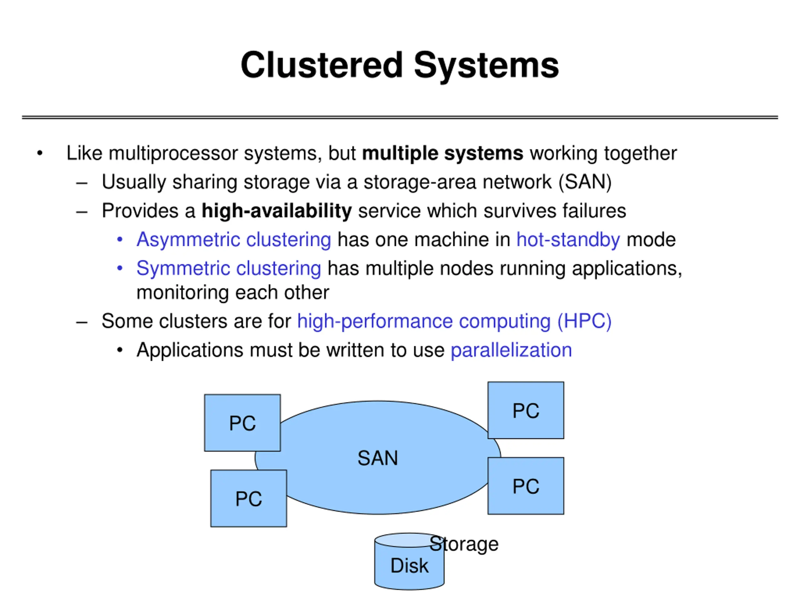 Clustered Systems Like multiprocessor systems, but multiple systems working together Usually sharing storage via a storage-area network (SAN) Provides a high-availability service which survives failures Asymmetric clustering has one machine in hot-standby mode Symmetric clustering has multiple nodes running applications, monitoring each other Some clusters are for high-performance computing (HPC) Applications must be written to use parallelization PC PC SAN PC PC Storage Disk