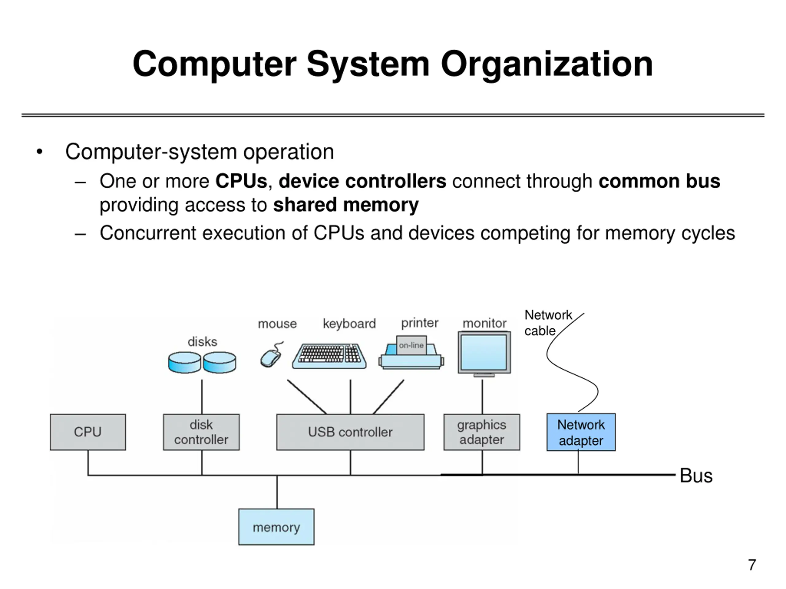 Computer System Organization Computer-system operation One or more CPUs, device controllers connect through common bus providing access to shared memory Concurrent execution of CPUs and devices competing for memory cycles Network cable Network adapter Bus 7