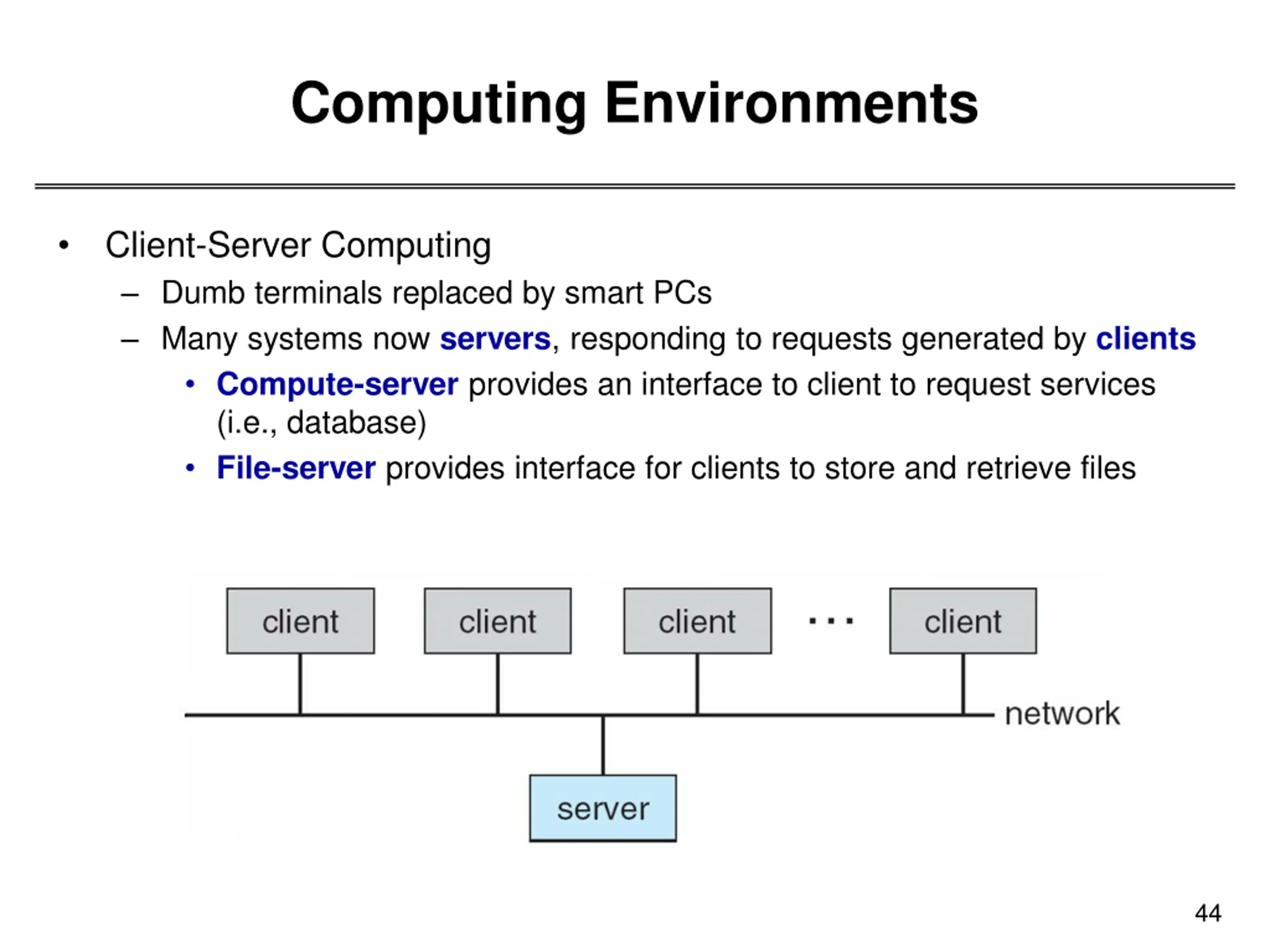 Computing Environments Client-Server Computing Dumb terminals replaced by smart PCs Many systems now servers, responding to requests generated by clients Compute-server provides an interface to client to request services (i.e., database) File-server provides interface for clients to store and retrieve files 44