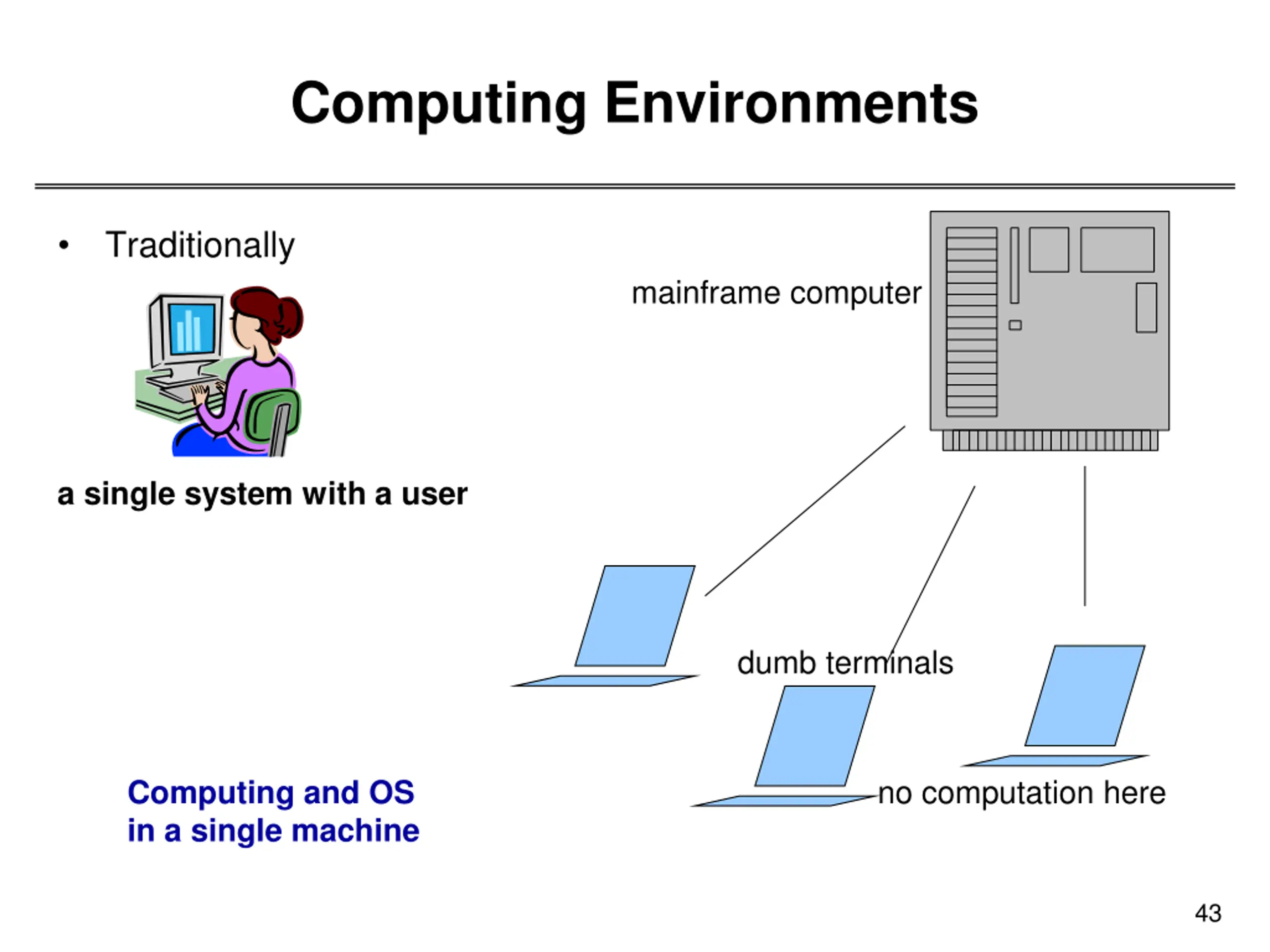 Computing Environments Traditionally mainframe computer a single system with a user dumb terminals no computation here Computing and OS in a single machine 43