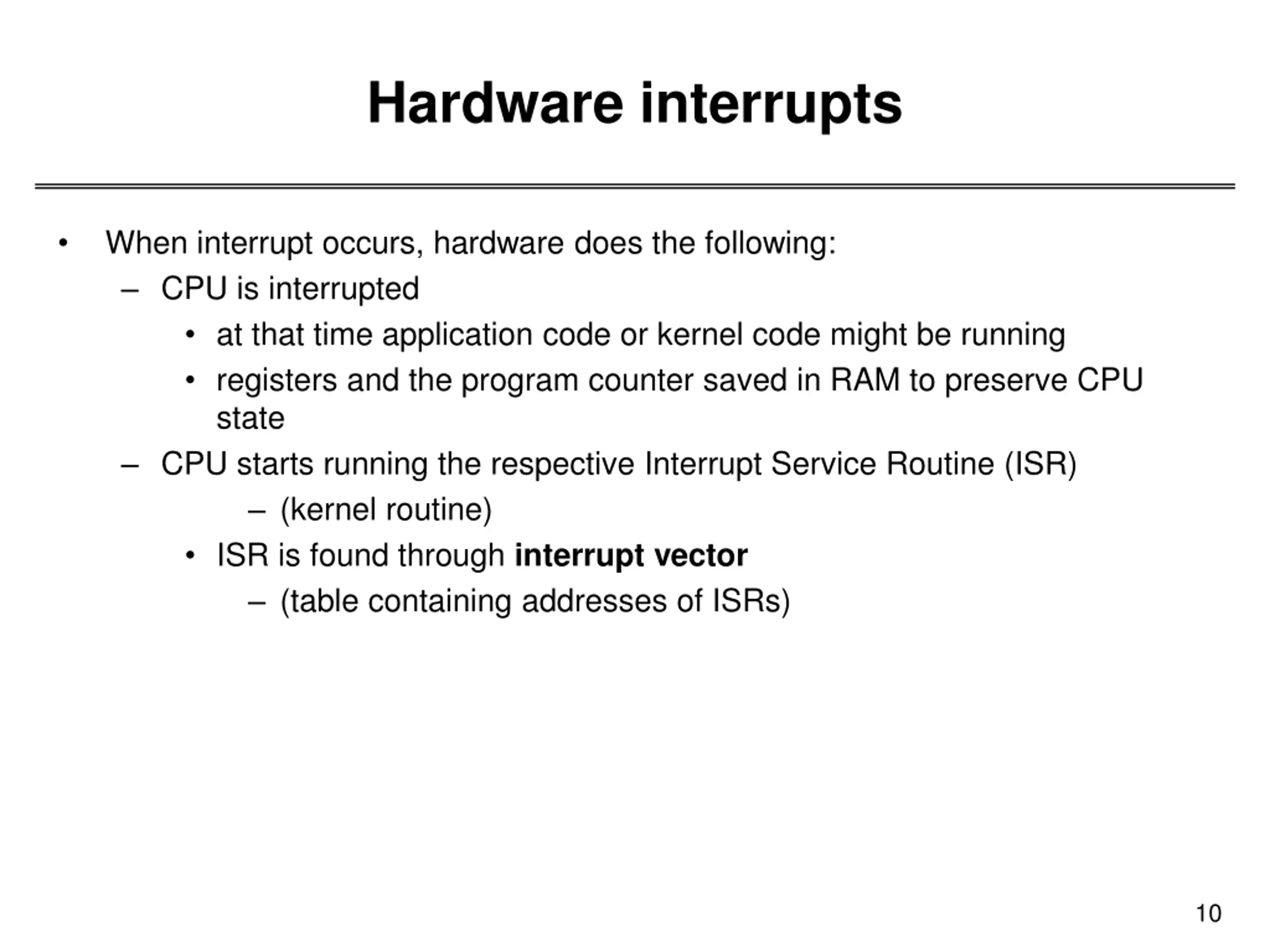 Hardware interrupts When interrupt occurs, hardware does the following: CPU is interrupted at that time application code or kernel code might be running registers and the program counter saved in RAM to preserve CPU state CPU starts running the respective Interrupt Service Routine (ISR) (kernel routine) ISR is found through interrupt vector (table containing addresses of ISRs) 10
