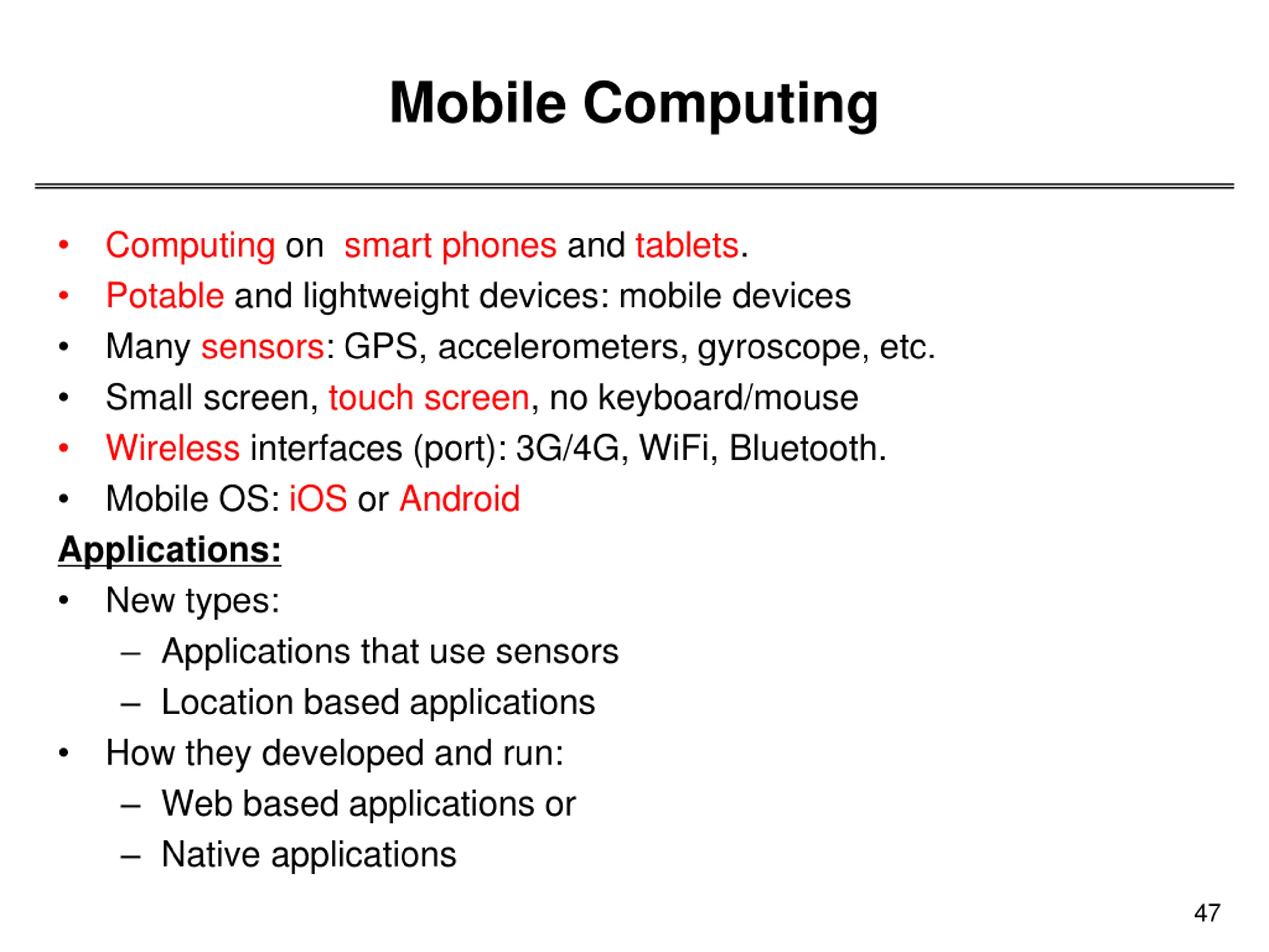 Mobile Computing Computing on smart phones and tablets. Potable and lightweight devices: mobile devices Many sensors: GPS, accelerometers, gyroscope, etc. Small screen, touch screen, no keyboard/mouse Wireless interfaces (port): 3G/4G, WiFi, Bluetooth. Mobile OS: iOS or Android Applications: New types: Applications that use sensors Location based applications How they developed and run: Web based applications or Native applications 47