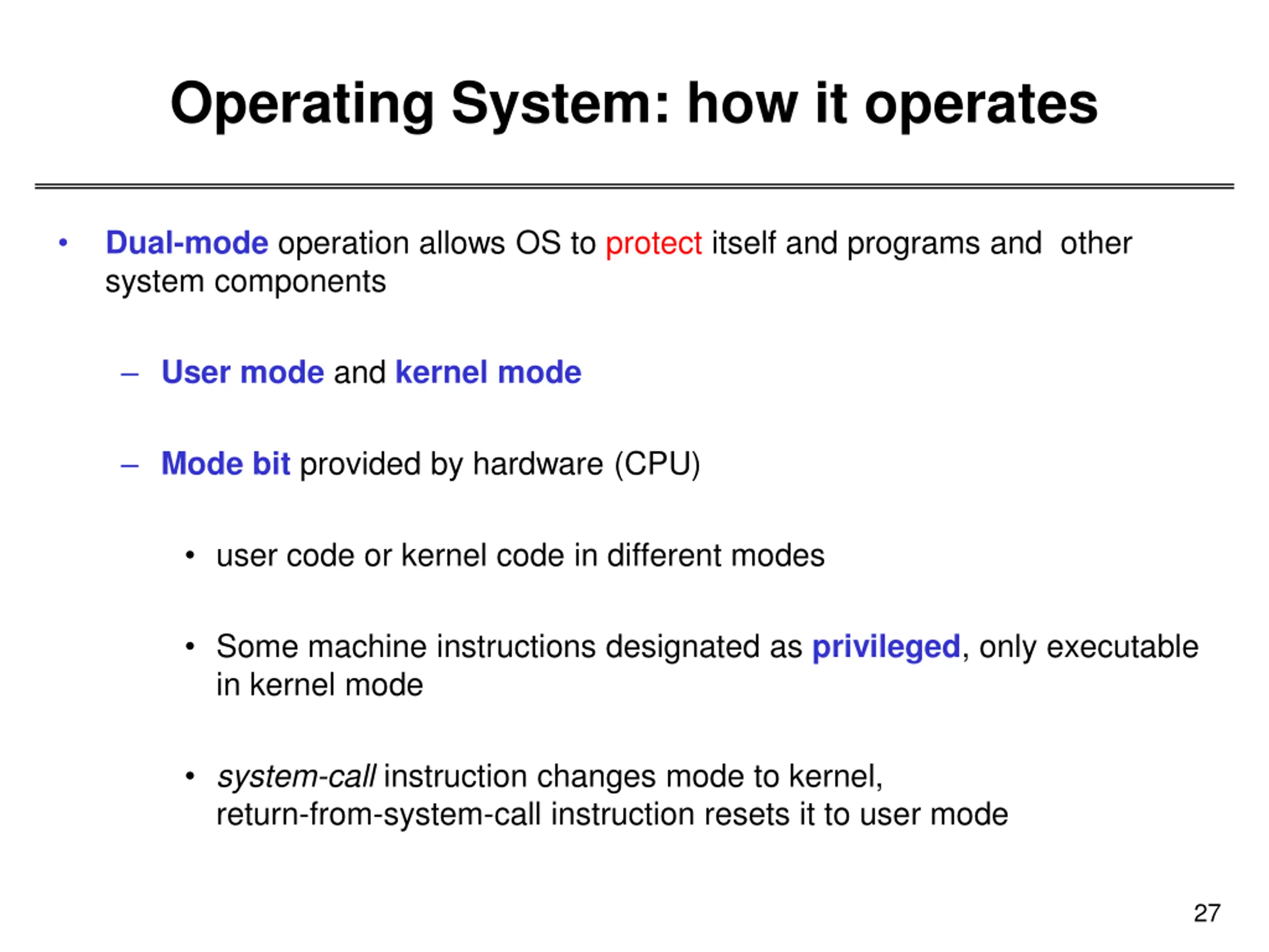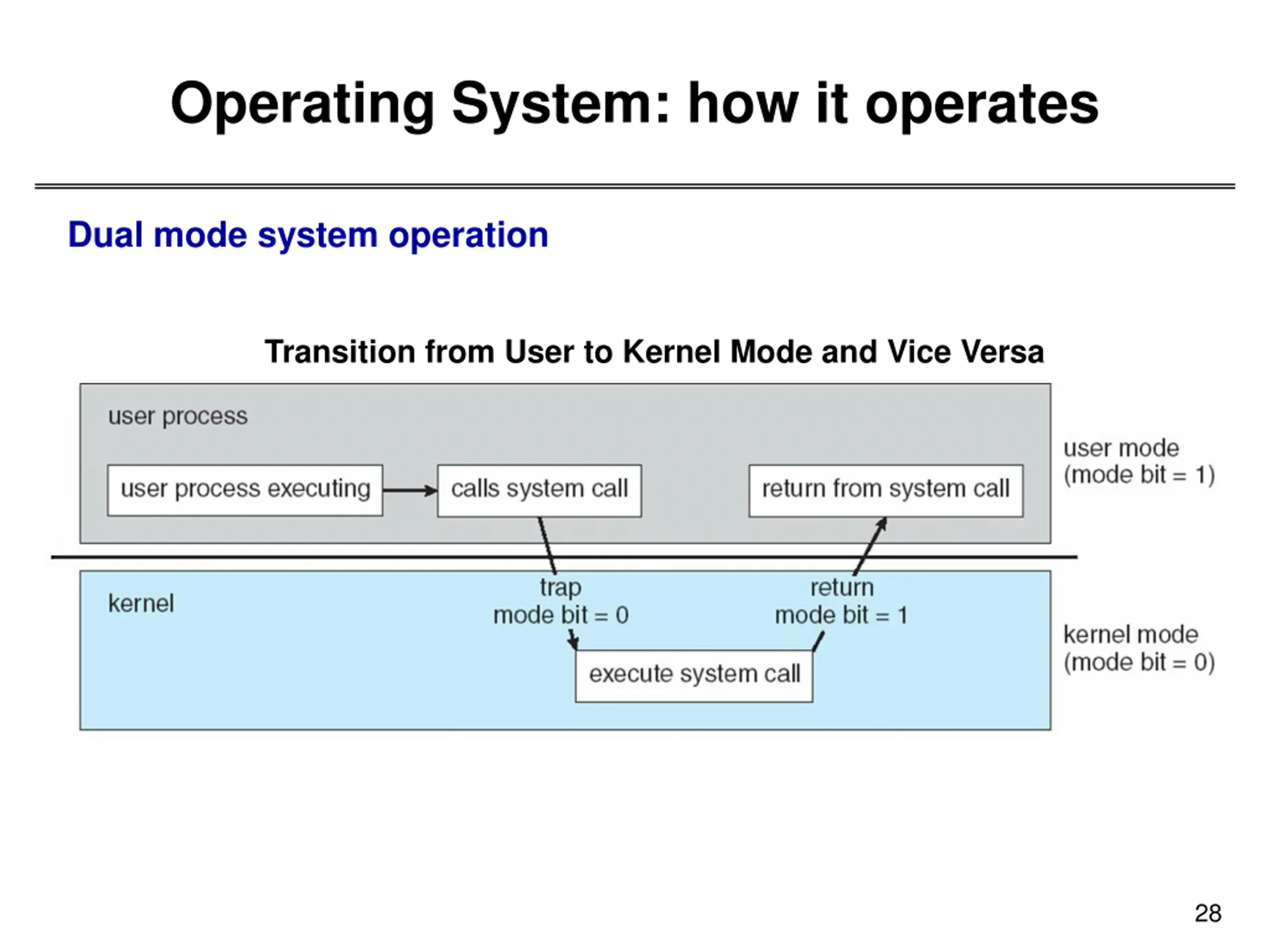 Operating System: how it operates Dual-mode operation allows OS to protect itself and programs and other system components User mode and kernel mode Mode bit provided by hardware (CPU) user code or kernel code in different modes Some machine instructions designated as privileged, only executable in kernel mode system-call instructionchanges mode to kernel, return-from-system-call instruction resets it to user mode 27
