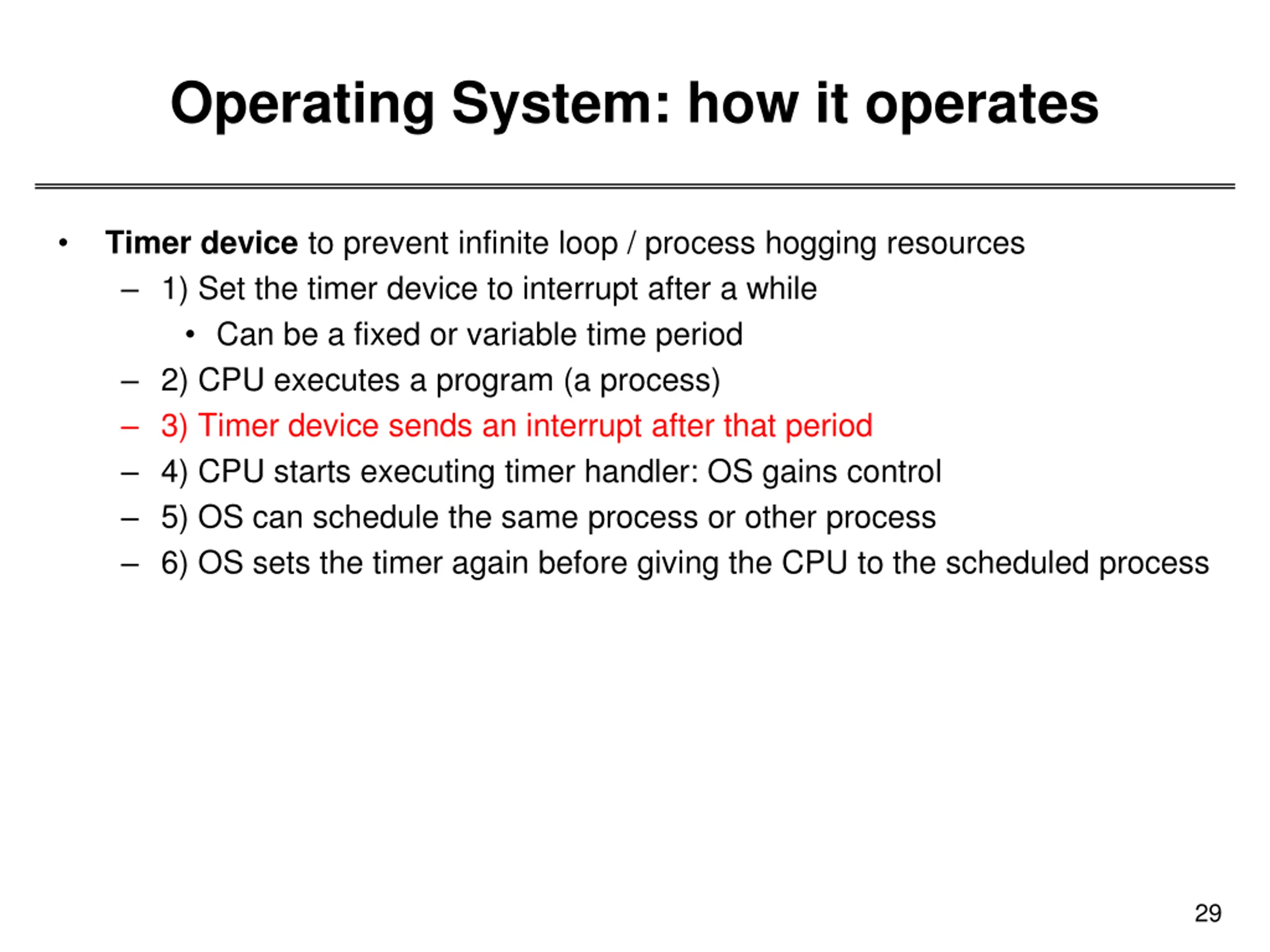 Operating System: how it operates Timerdevice to prevent infinite loop / process hogging resources 1) Set the timer device to interrupt after a while Can be a fixed or variable time period 2) CPU executes a program (a process) 3) Timer device sends an interrupt after that period 4) CPU starts executing timer handler: OS gains control 5) OS can schedule the same process or other process 6) OS sets the timer again before giving the CPU to the scheduled process 29