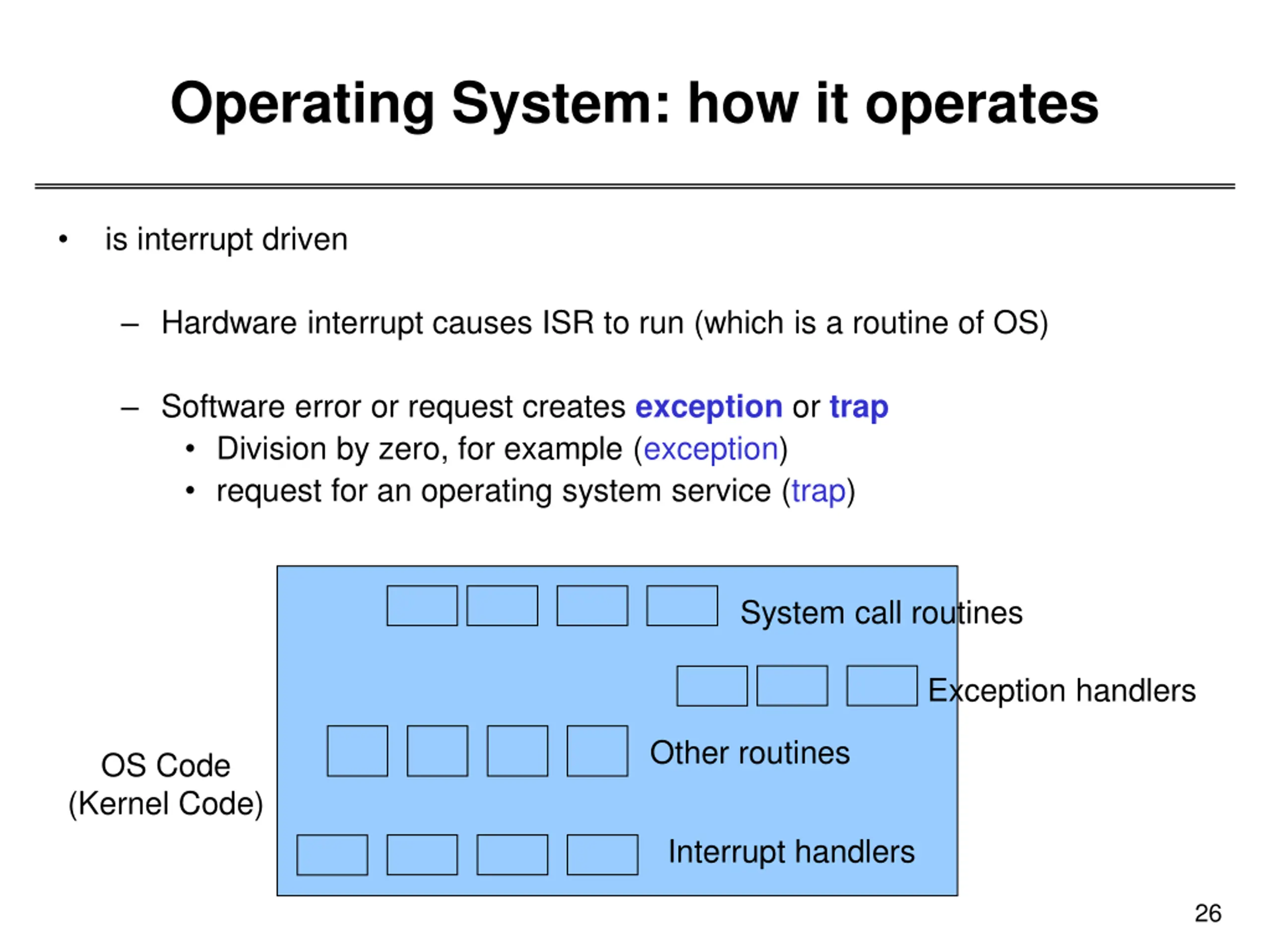 Operating System: how it operates is interrupt driven Hardware interrupt causes ISR to run (which is a routine of OS) Software error or request creates exception or trap Division by zero, for example (exception) request for an operating system service (trap) System call routines Exception handlers Other routines OS Code (Kernel Code) Interrupt handlers 26
