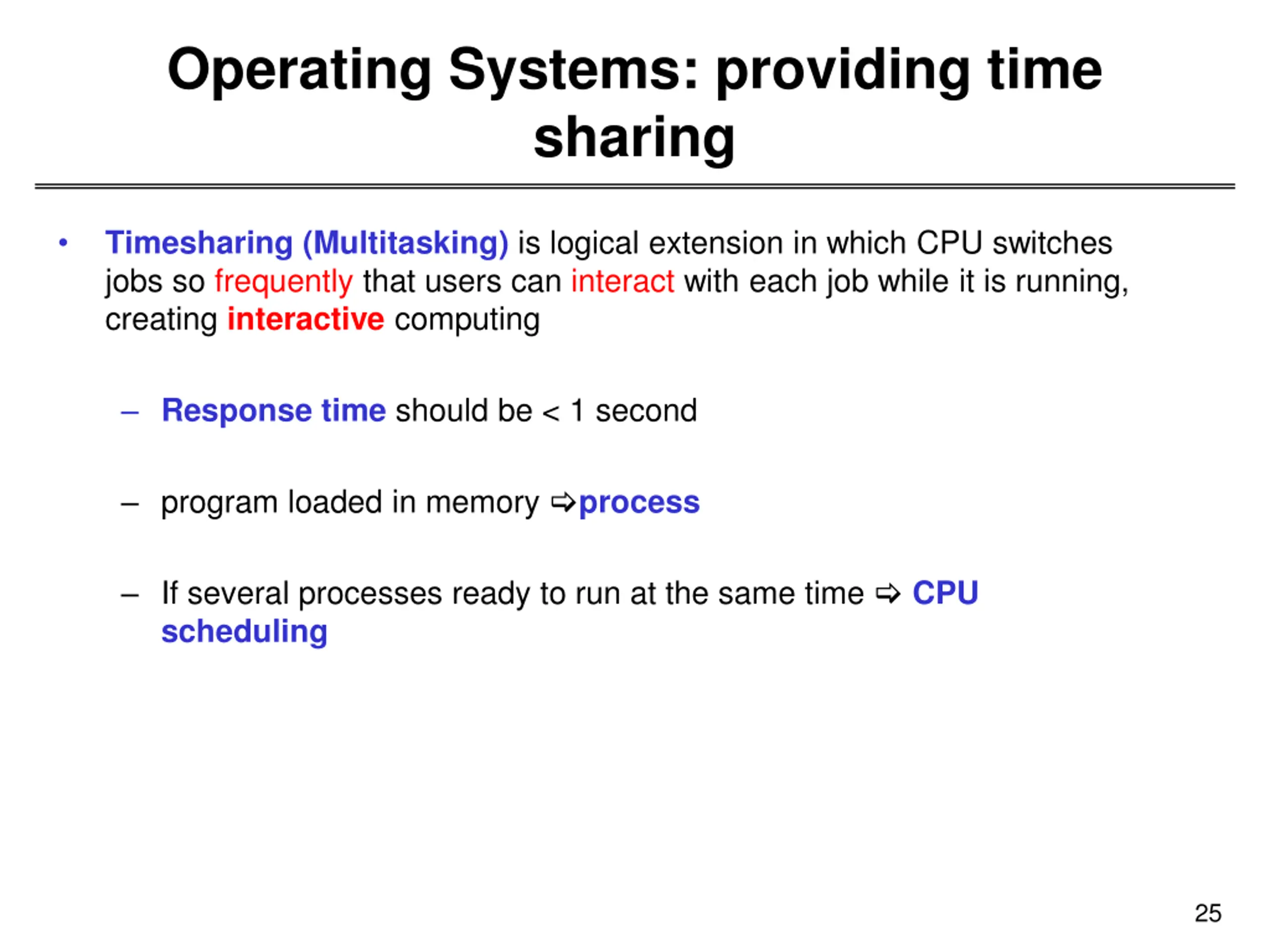 Operating Systems: providing time sharing Timesharing (Multitasking) is logical extension in which CPU switches jobs so frequently that users can interact with each job while it is running, creating interactive computing Response time should be < 1 second program loaded in memory process If several processes ready to run at the same time CPU scheduling 25