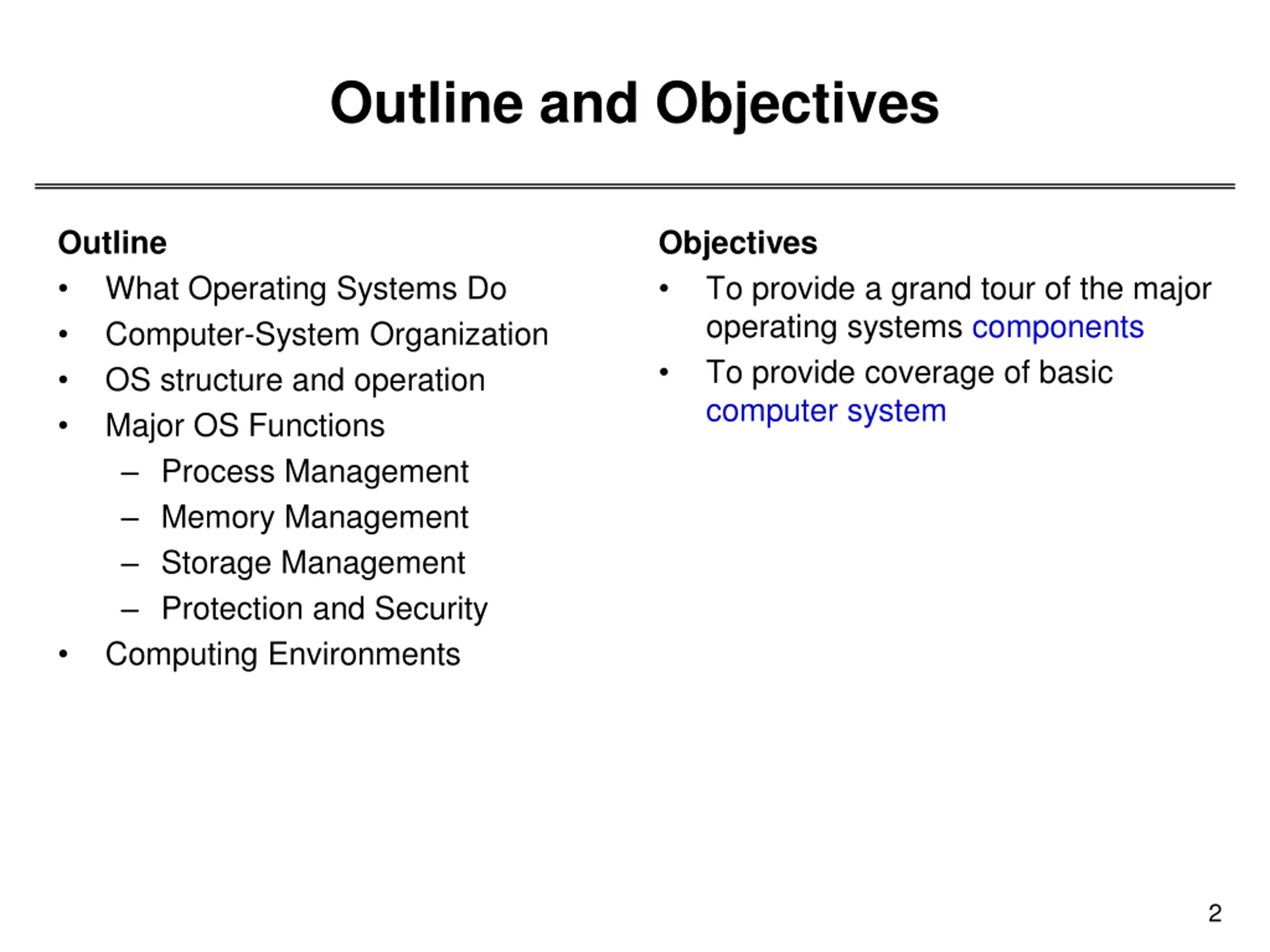 Outline and Objectives Outline What Operating Systems Do Computer-System Organization OS structure and operation Major OS Functions Process Management Memory Management Storage Management Protection and Security Computing Environments Objectives To provide a grand tour of the major operating systems components To provide coverage of basic computer system 2