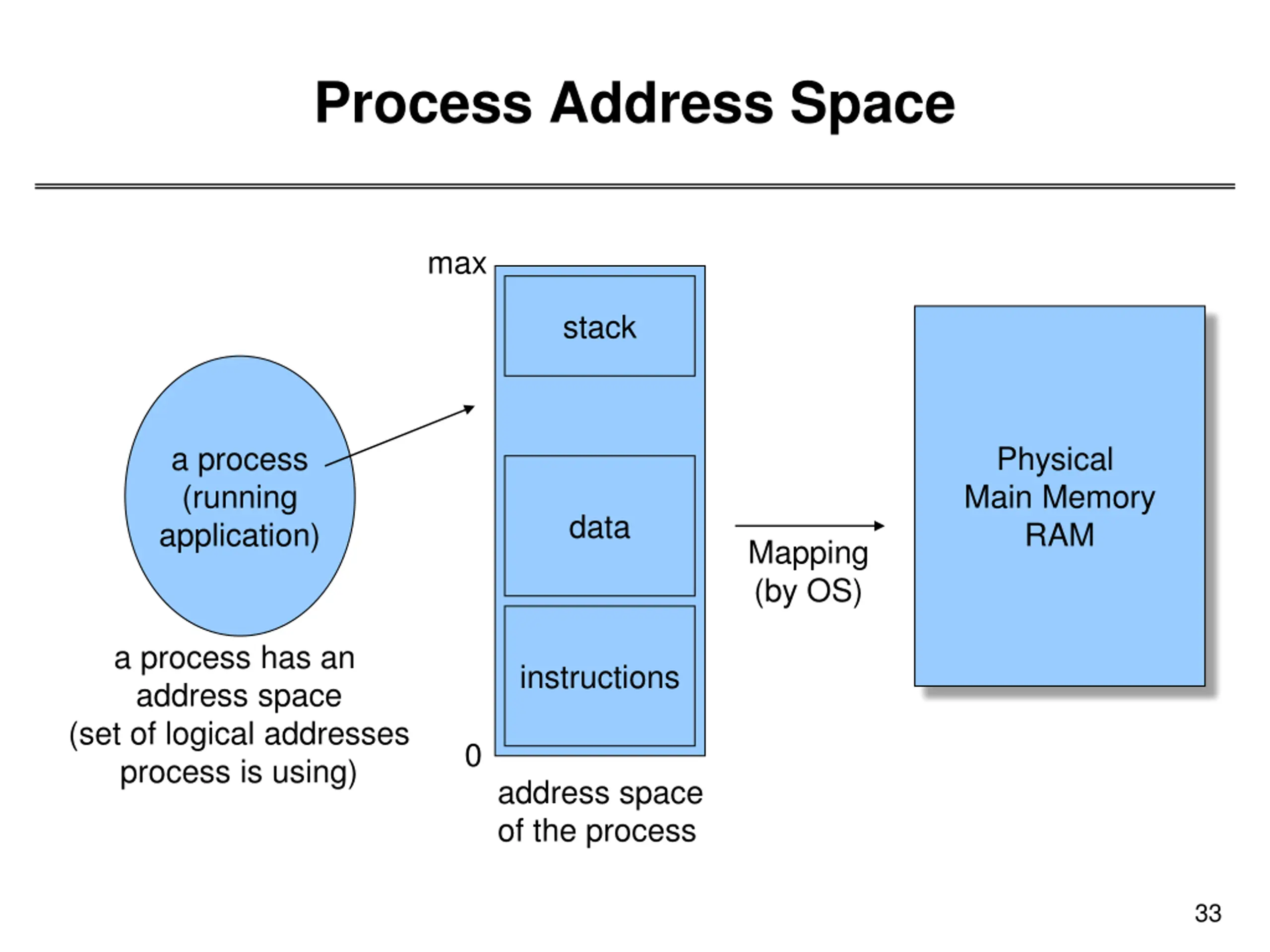 Process Address Space max stack a process (running application) Physical Main Memory RAM data Mapping (by OS) a process has an address space (set of logical addresses process is using) instructions 0 address space of the process 33