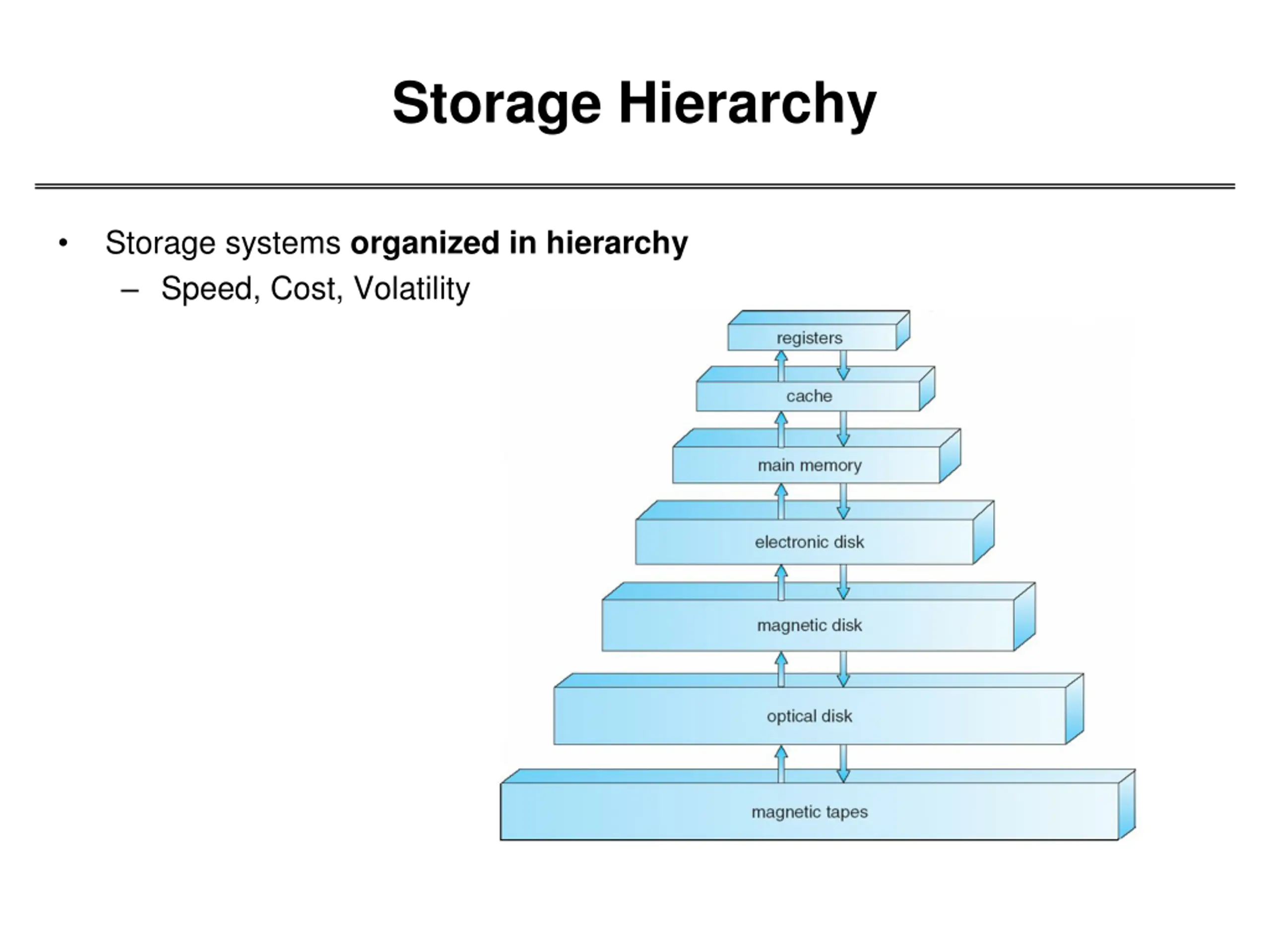 Storage Hierarchy Storage systems organized in hierarchy Speed, Cost, Volatility