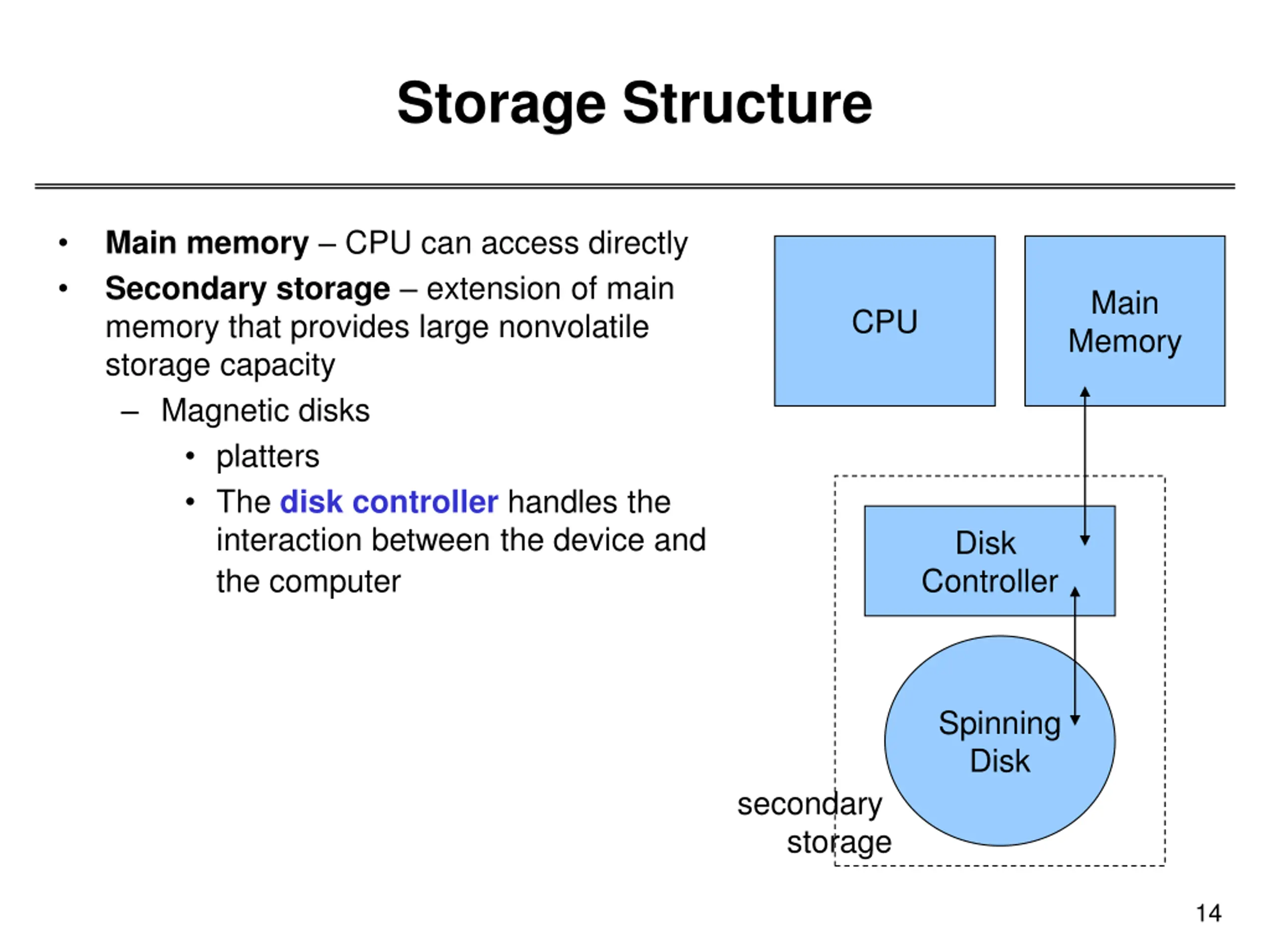 Storage Structure Main memory CPU can access directly Secondary storage extension of main memory that provides large nonvolatile storage capacity Magnetic disks platters The disk controller handles the interaction between the device and the computer Main Memory CPU Disk Controller Spinning Disk secondary storage 14