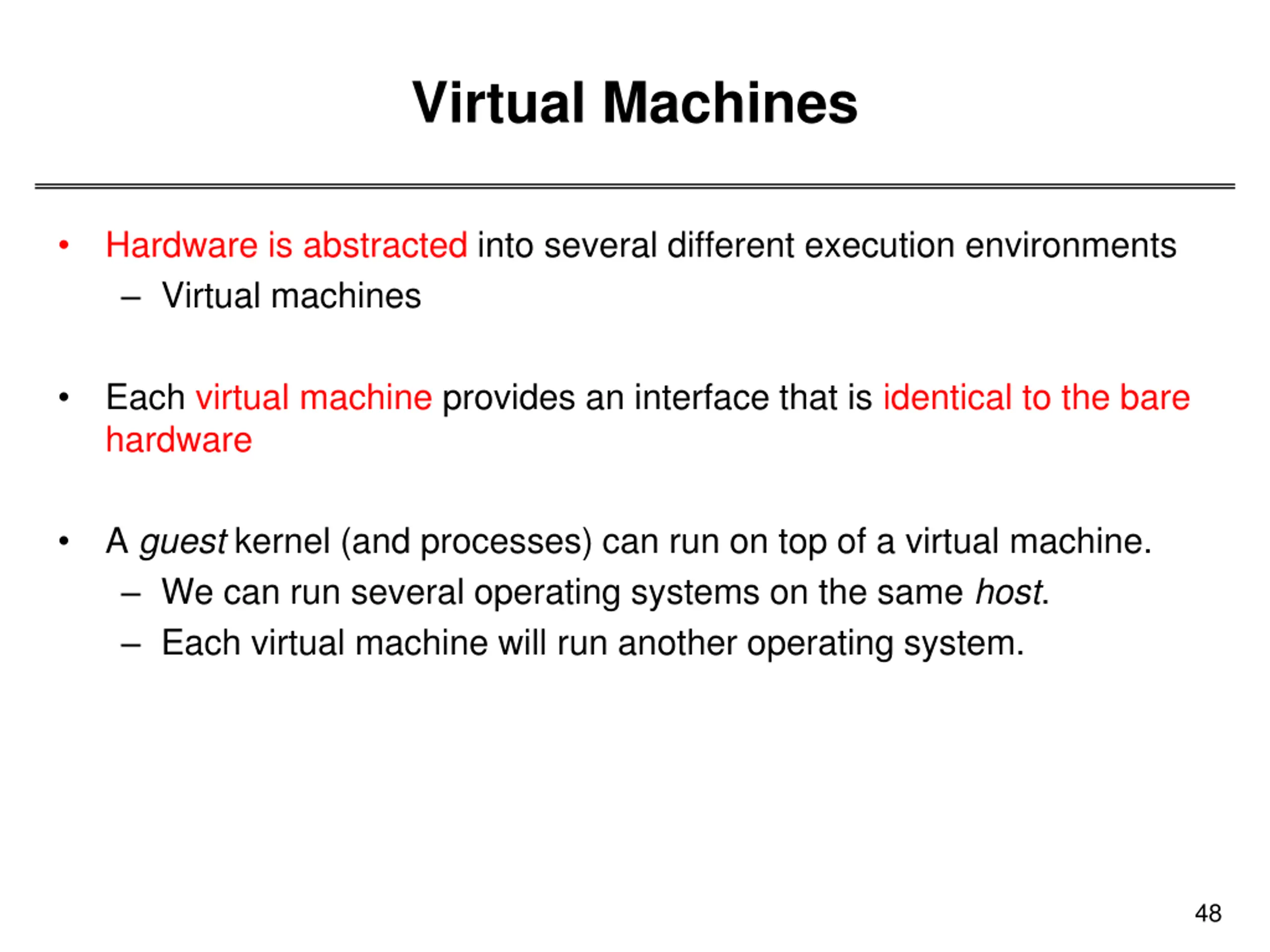 Virtual Machines Hardware is abstracted into several different execution environments Virtual machines Each virtual machine provides an interface that is identical to the bare hardware A guest kernel (and processes) can run on top of a virtual machine. We can run several operating systems on the same host. Each virtual machine will run another operating system. 48