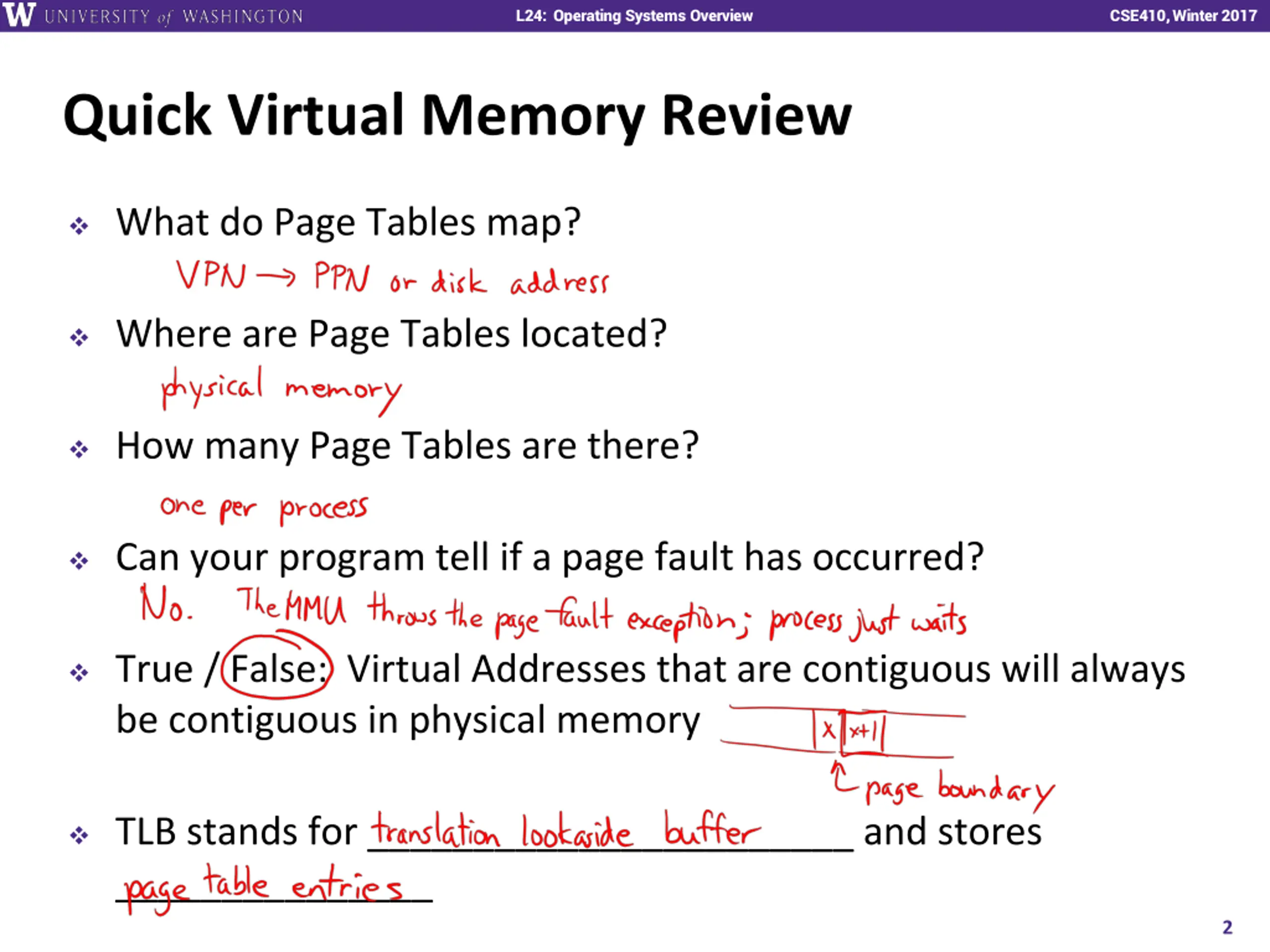 L01: Intro, Combinational Logic L24: Operating Systems Overview CSE369, Autumn 2016 CSE410, Winter 2017 Quick Virtual Memory Review What do Page Tables map? Where are Page Tables located? How many Page Tables are there? Can your program tell if a page fault has occurred? True / False: Virtual Addresses that are contiguous will always be contiguous in physical memory TLB stands for _______________________ and stores _______________ 2