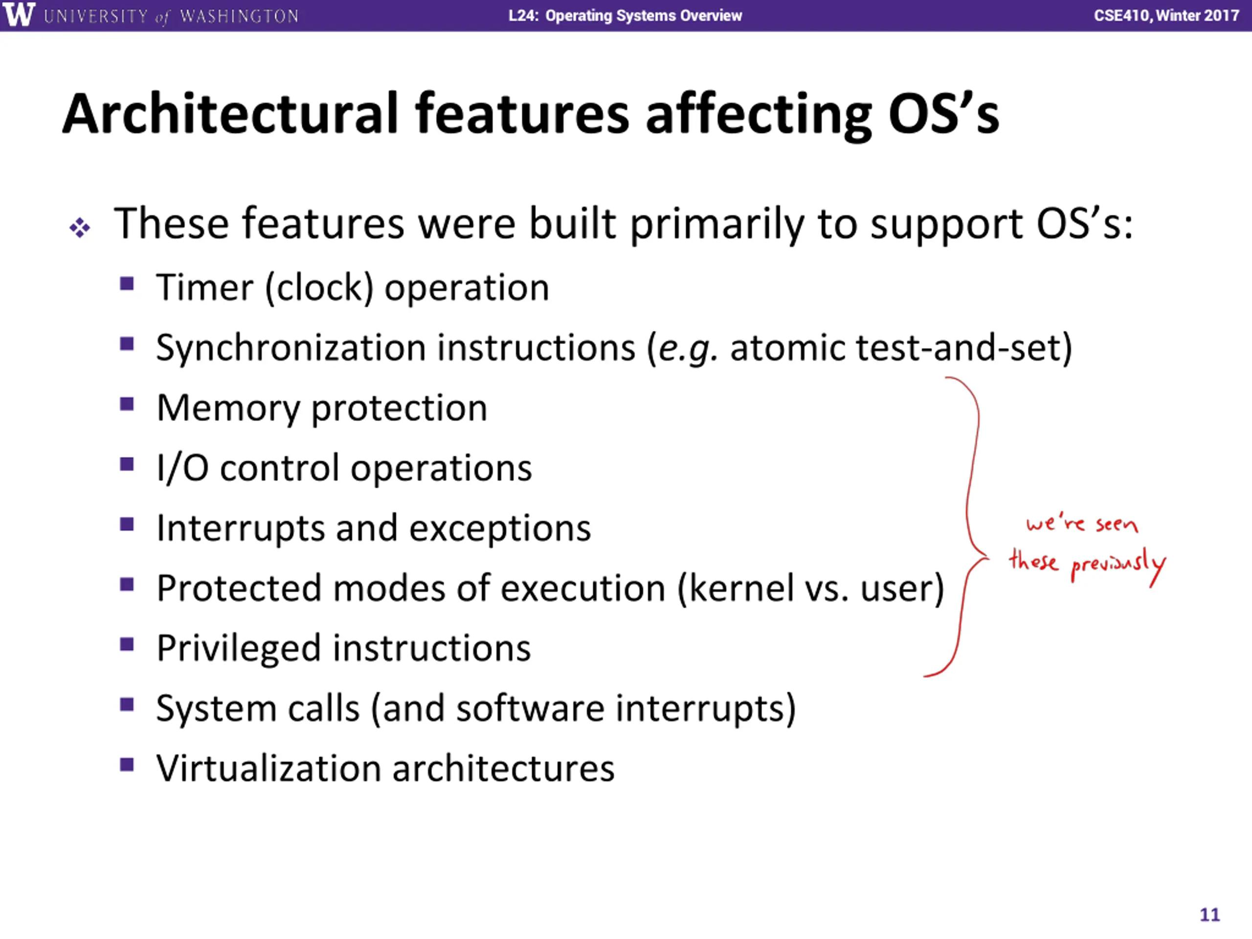 L01: Intro, Combinational Logic L24: Operating Systems Overview CSE369, Autumn 2016 CSE410, Winter 2017 Architectural features affecting OS s These features were built primarily to support OS s: Timer (clock) operation Synchronization instructions (e.g. atomic test-and-set) Memory protection I/O control operations Interrupts and exceptions Protected modes of execution (kernel vs. user) Privileged instructions System calls (and software interrupts) Virtualization architectures 11