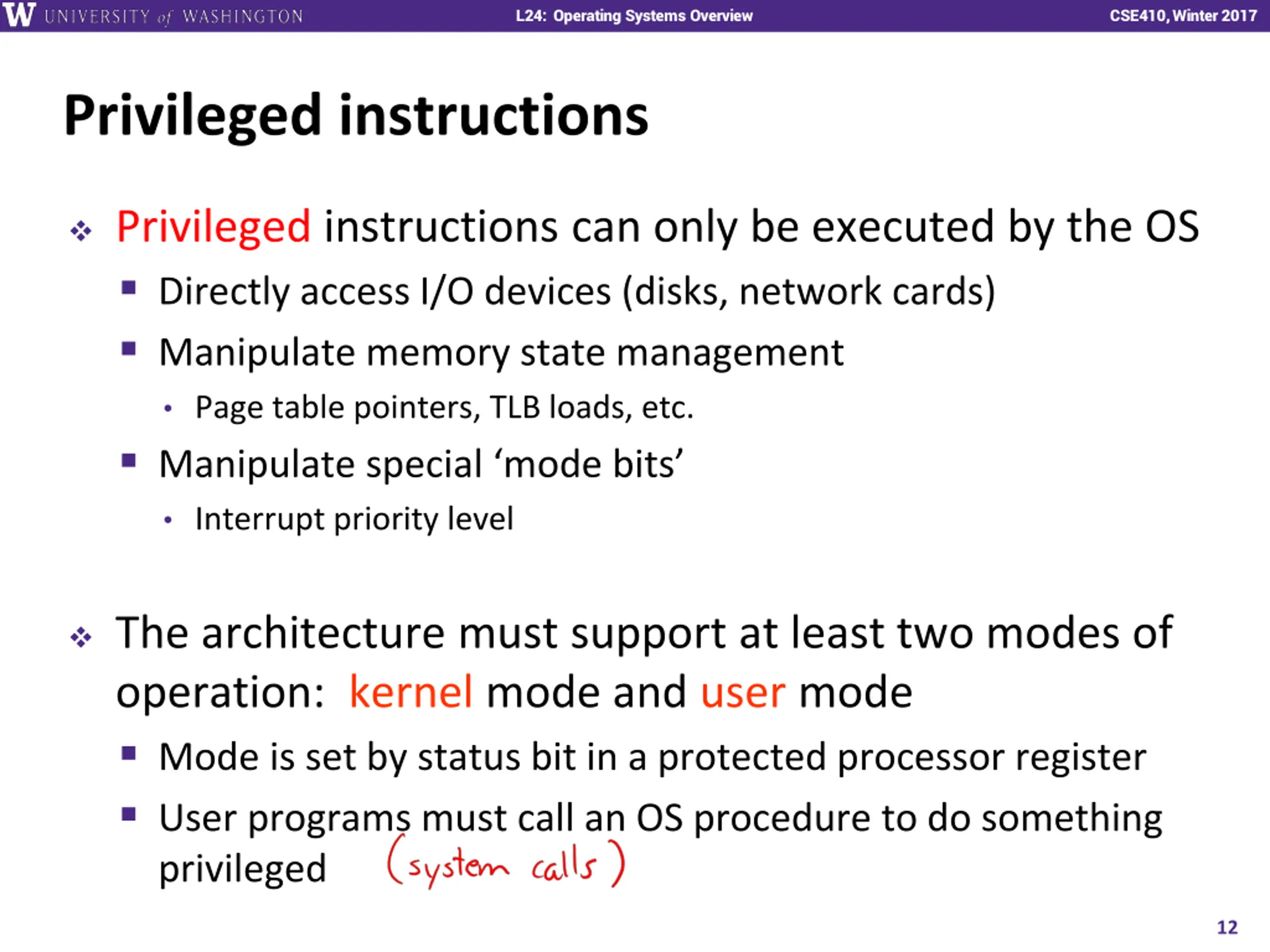 L01: Intro, Combinational Logic L24: Operating Systems Overview CSE369, Autumn 2016 CSE410, Winter 2017 Privileged instructions Privileged instructions can only be executed by the OS Directly access I/O devices (disks, network cards) Manipulate memory state management Page table pointers, TLB loads, etc. Manipulate special mode bits Interrupt priority level The architecture must support at least two modes of operation: kernel mode and user mode Mode is set by status bit in a protected processor register User programs must call an OS procedure to do something privileged 12