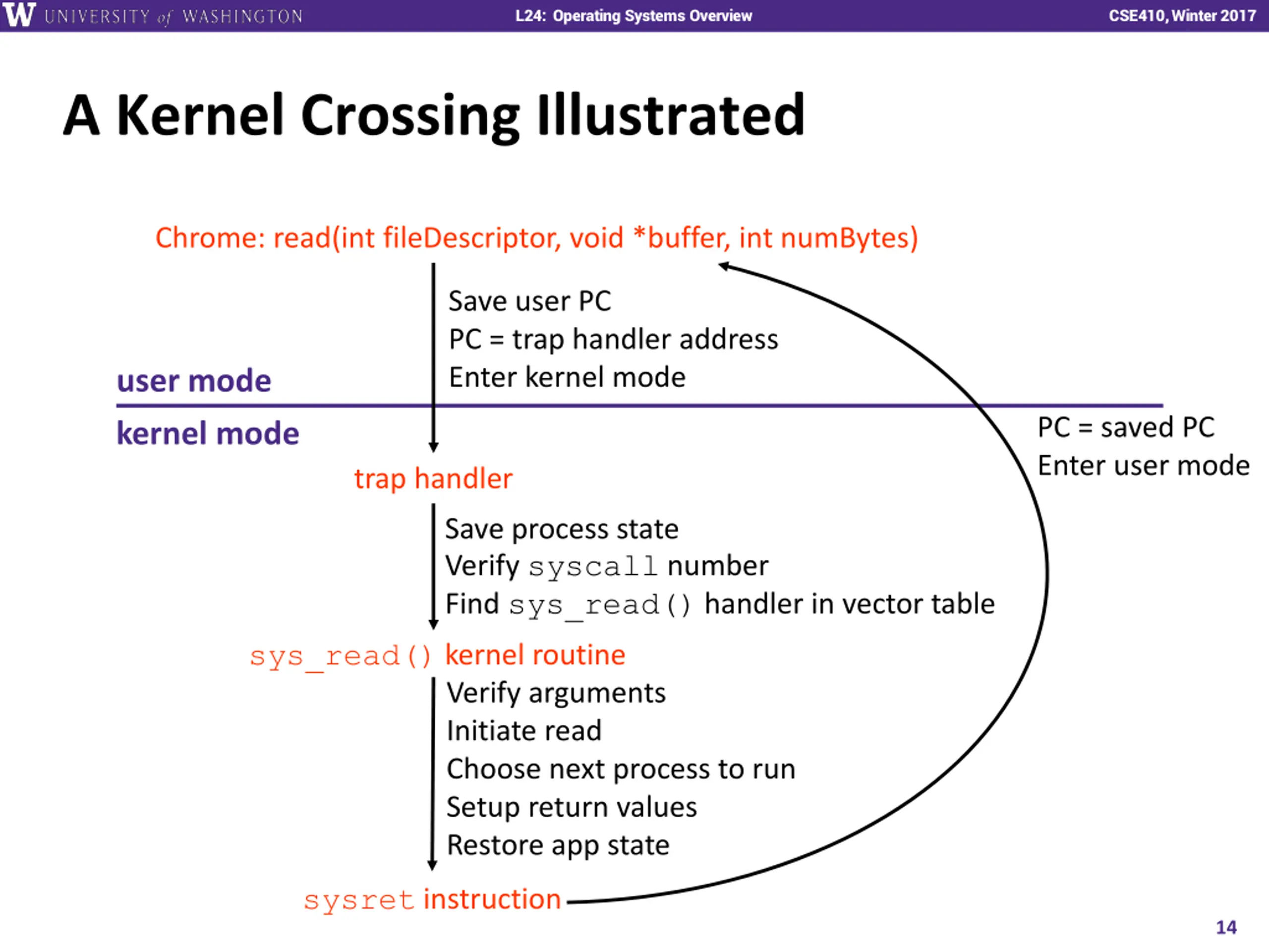 L01: Intro, Combinational Logic L24: Operating Systems Overview CSE369, Autumn 2016 CSE410, Winter 2017 A Kernel Crossing Illustrated Chrome: read(int fileDescriptor, void *buffer, int numBytes) Save user PC PC = trap handler address Enter kernel mode user mode kernel mode PC = saved PC Enter user mode trap handler Save process state Verify syscall number Find sys_read() handler in vector table sys_read() kernel routine Verify arguments Initiate read Choose next process to run Setup return values Restore app state sysret instruction 14