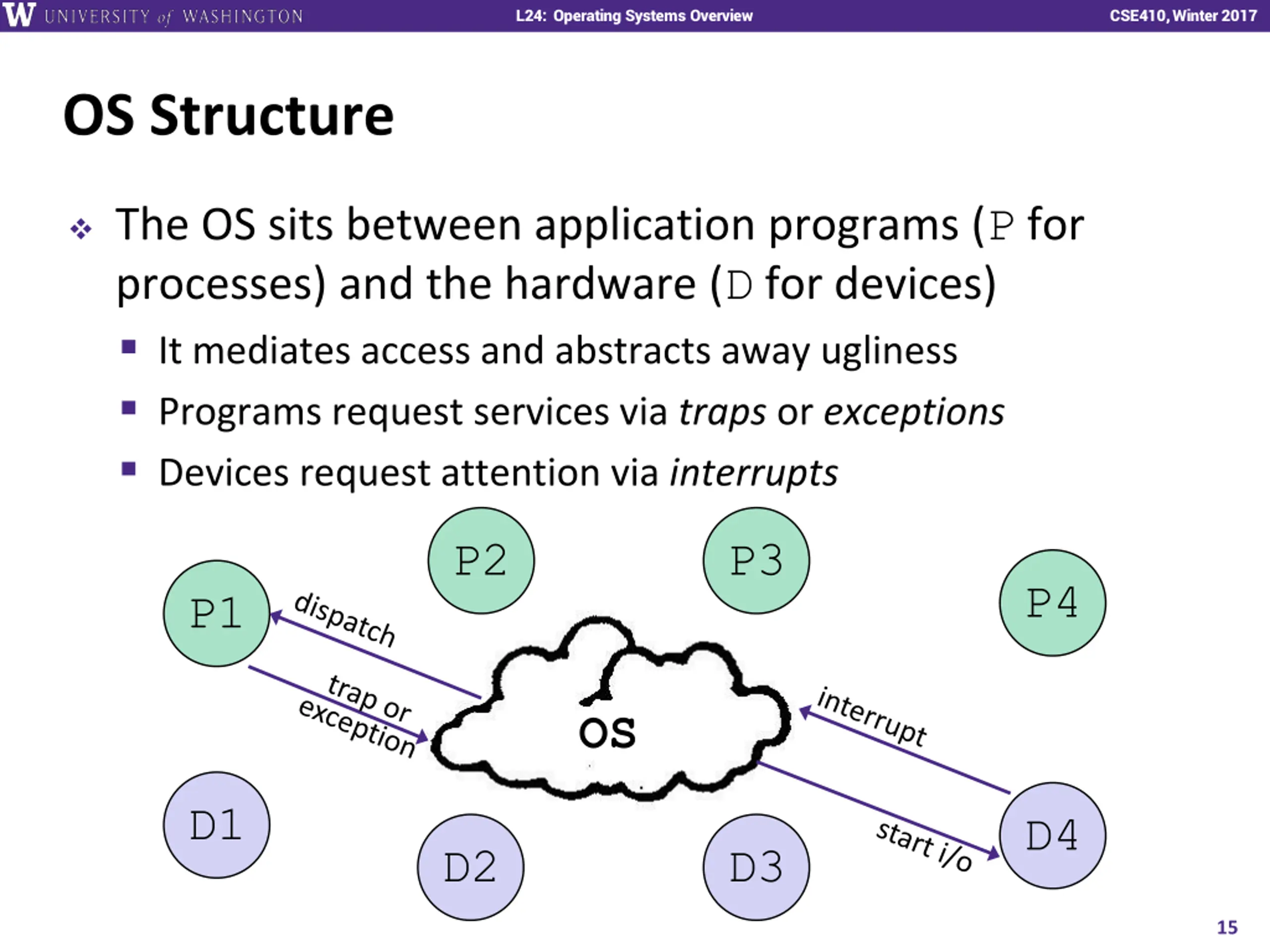 L01: Intro, Combinational Logic L24: Operating Systems Overview CSE369, Autumn 2016 CSE410, Winter 2017 OS Structure The OS sits between application programs (P for processes) and the hardware (D for devices) It mediates access and abstracts away ugliness Programs request services via traps or exceptions Devices request attention via interrupts P2 P3 P4 P1 OS D1 D4 D2 D3 15