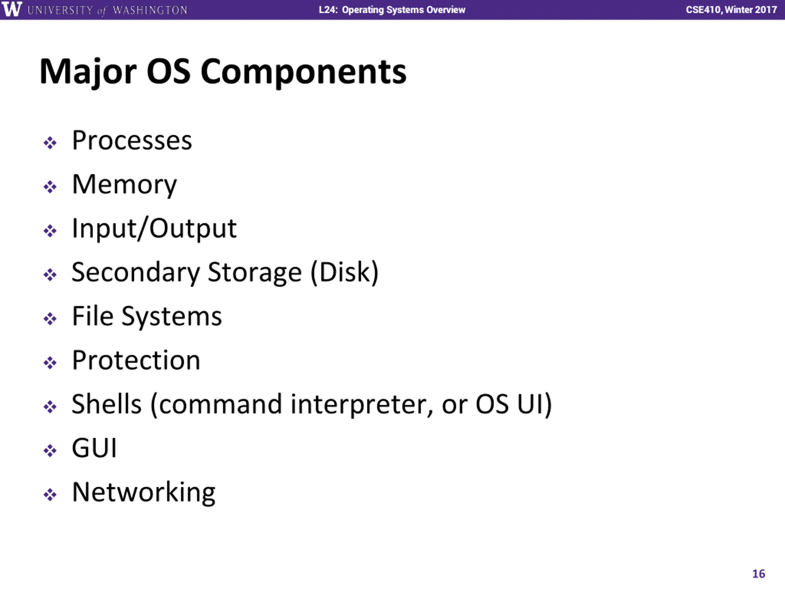 L01: Intro, Combinational Logic L24: Operating Systems Overview CSE369, Autumn 2016 CSE410, Winter 2017 Major OS Components Processes Memory Input/Output Secondary Storage (Disk) File Systems Protection Shells (command interpreter, or OS UI) GUI Networking 16