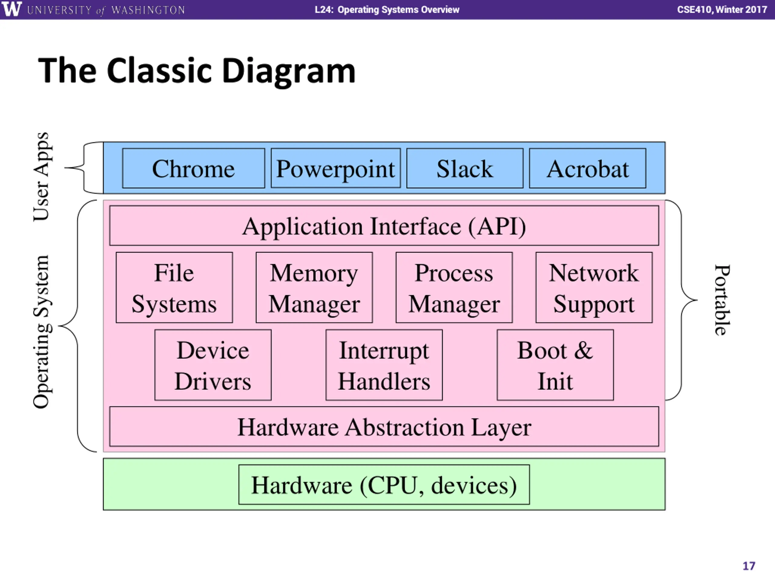 L01: Intro, Combinational Logic L24: Operating Systems Overview CSE369, Autumn 2016 CSE410, Winter 2017 The Classic Diagram User Apps Chrome Powerpoint Slack Acrobat Application Interface (API) Operating System File Systems Memory Manager Process Manager Network Support Portable Device Drivers Interrupt Handlers Boot & Init Hardware Abstraction Layer Hardware (CPU, devices) 17