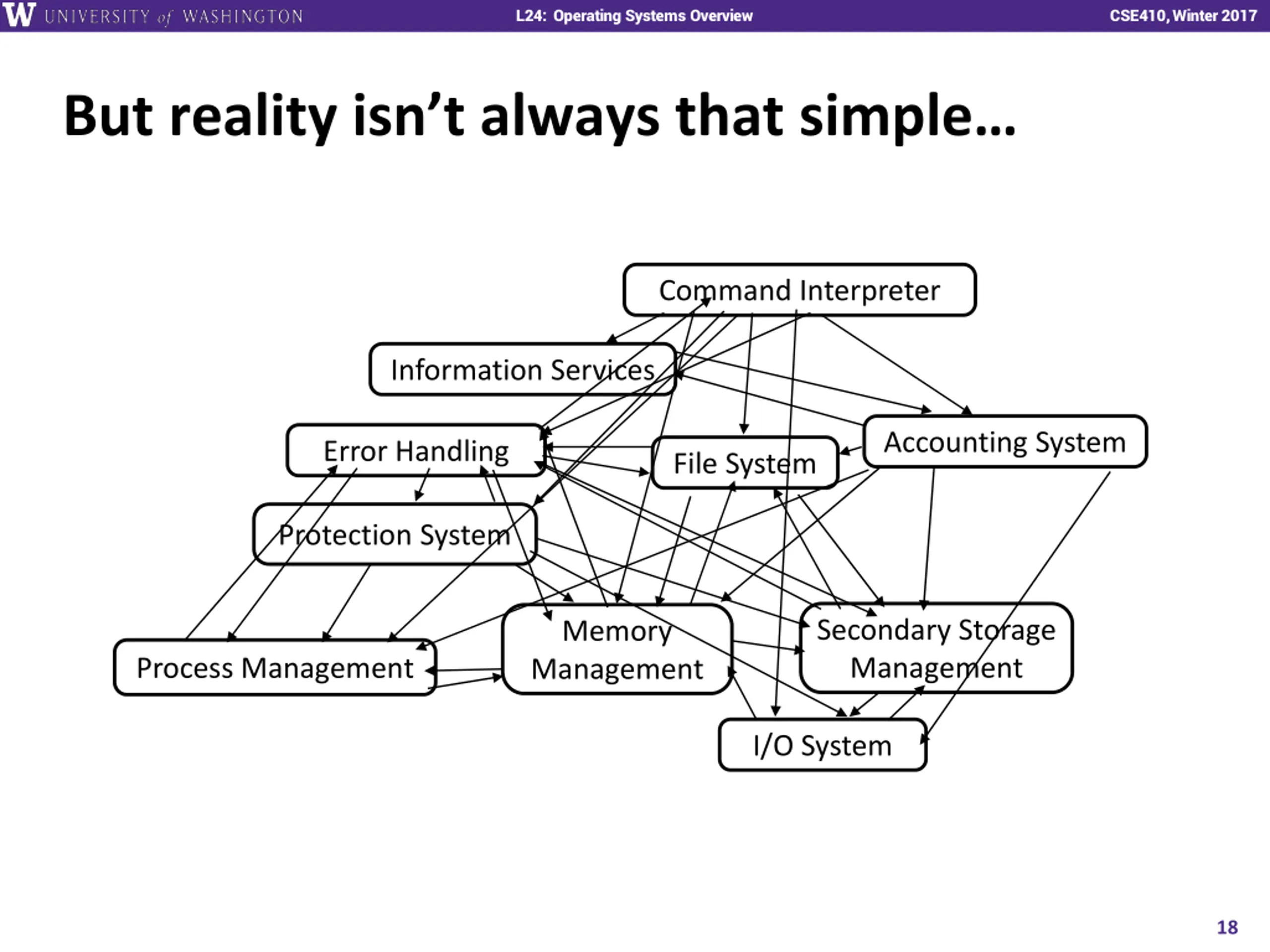 L01: Intro, Combinational Logic L24: Operating Systems Overview CSE369, Autumn 2016 CSE410, Winter 2017 But reality isn t always that simple Command Interpreter Information Services Accounting System Error Handling File System Protection System Secondary Storage Management Memory Management Process Management I/O System 18