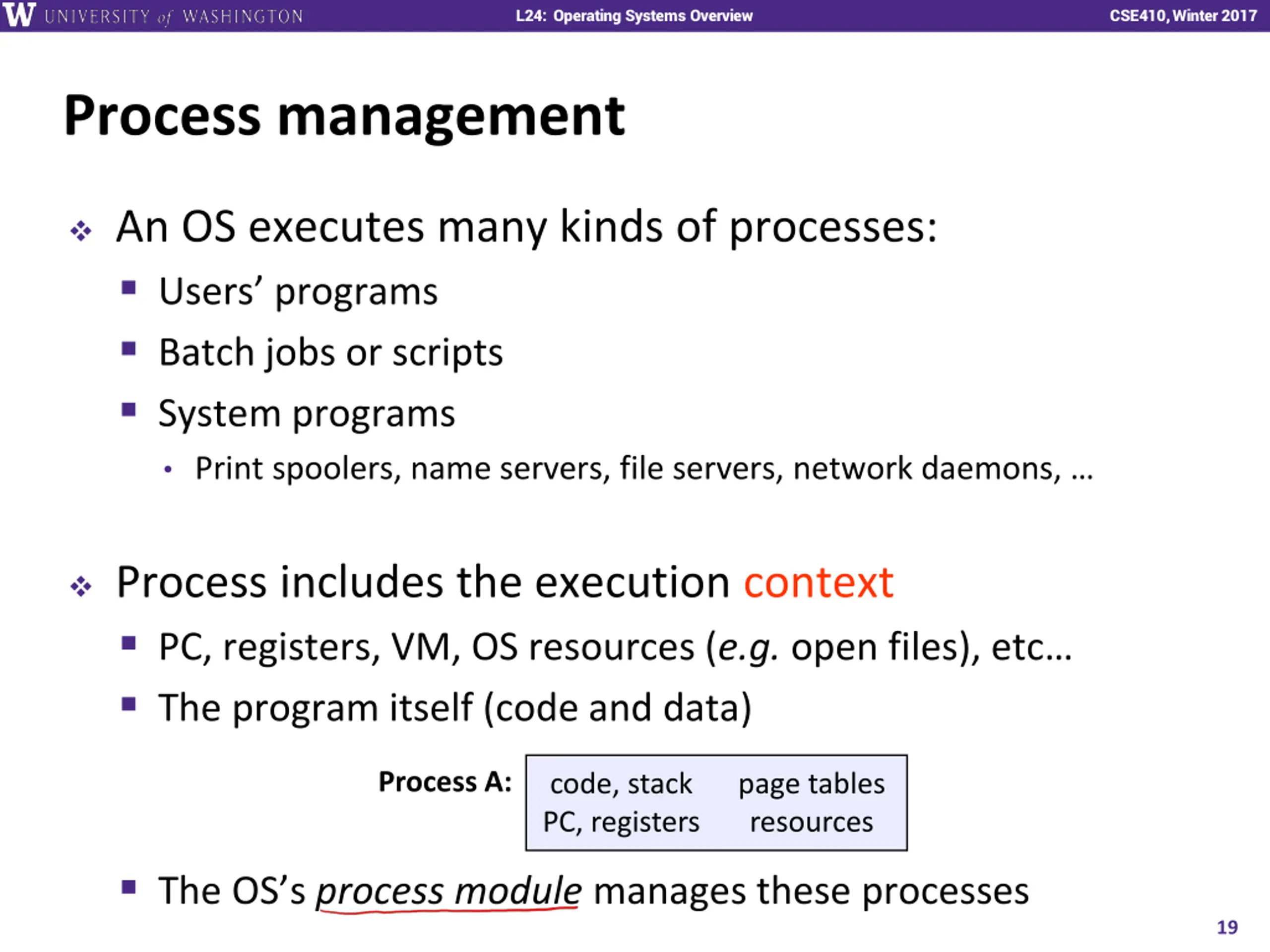 L01: Intro, Combinational Logic L24: Operating Systems Overview CSE369, Autumn 2016 CSE410, Winter 2017 Process management An OS executes many kinds of processes: Users programs Batch jobs or scripts System programs Print spoolers, name servers, file servers, network daemons, Process includes the execution context PC, registers, VM, OS resources (e.g.open files), etc The program itself (code and data) Process A: code, stack PC, registers page tables resources The OS s process module manages these processes 19