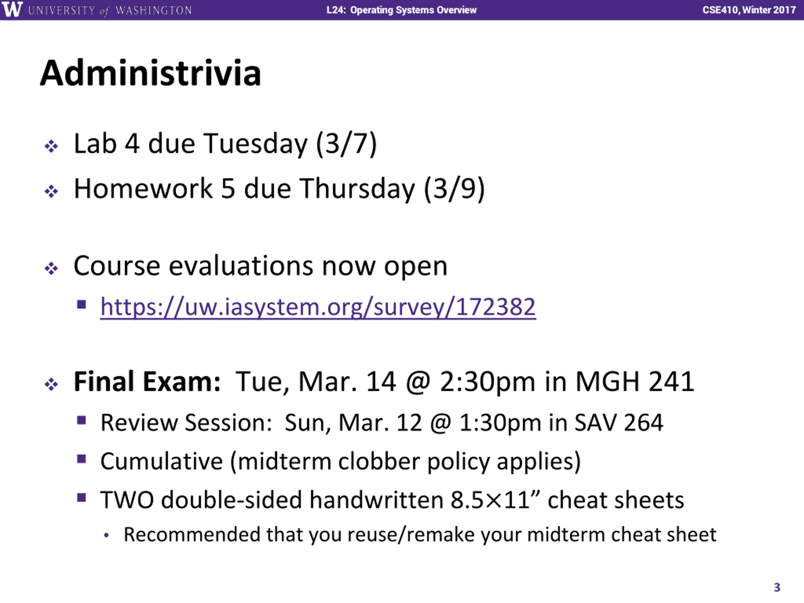 L01: Intro, Combinational Logic L24: Operating Systems Overview CSE369, Autumn 2016 CSE410, Winter 2017 Administrivia Lab 4 due Tuesday (3/7) Homework 5 due Thursday (3/9) Course evaluations now open https://uw.iasystem.org/survey/172382 https://uw.iasystem.org/survey/172382 Final Exam: Tue, Mar. 14 @ 2:30pm in MGH 241 Review Session: Sun, Mar. 12 @ 1:30pm in SAV 264 Cumulative (midterm clobber policy applies) TWO double-sided handwritten 8.5 11 cheat sheets Recommended that you reuse/remake your midterm cheat sheet 3