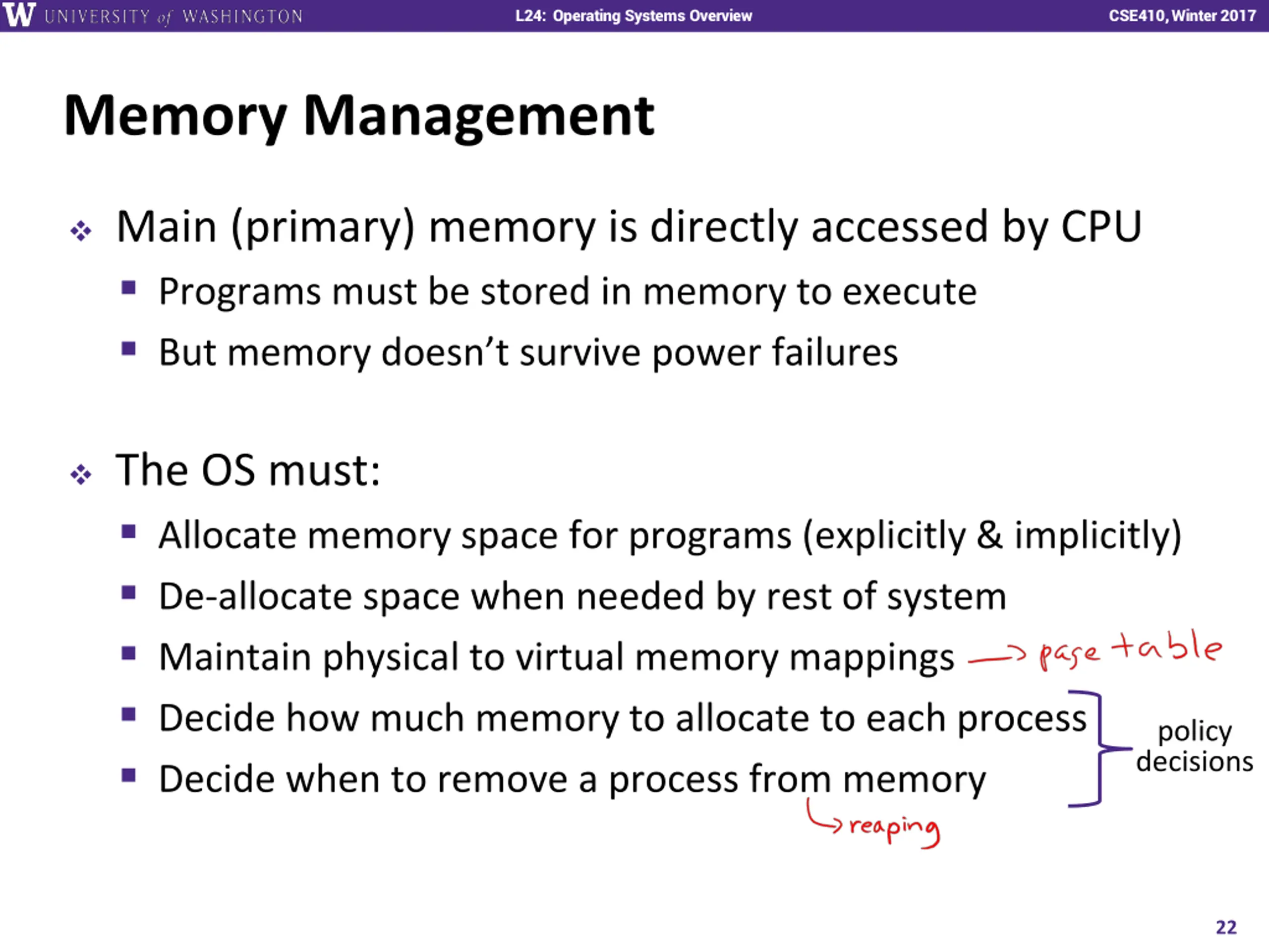 L01: Intro, Combinational Logic L24: Operating Systems Overview CSE369, Autumn 2016 CSE410, Winter 2017 Memory Management Main (primary) memory is directly accessed by CPU Programs must be stored in memory to execute But memory doesn t survive power failures The OS must: Allocate memory space for programs (explicitly & implicitly) De-allocate space when needed by rest of system Maintain physical to virtual memory mappings Decide how much memory to allocate to each process Decide when to remove a process from memory policy decisions 22