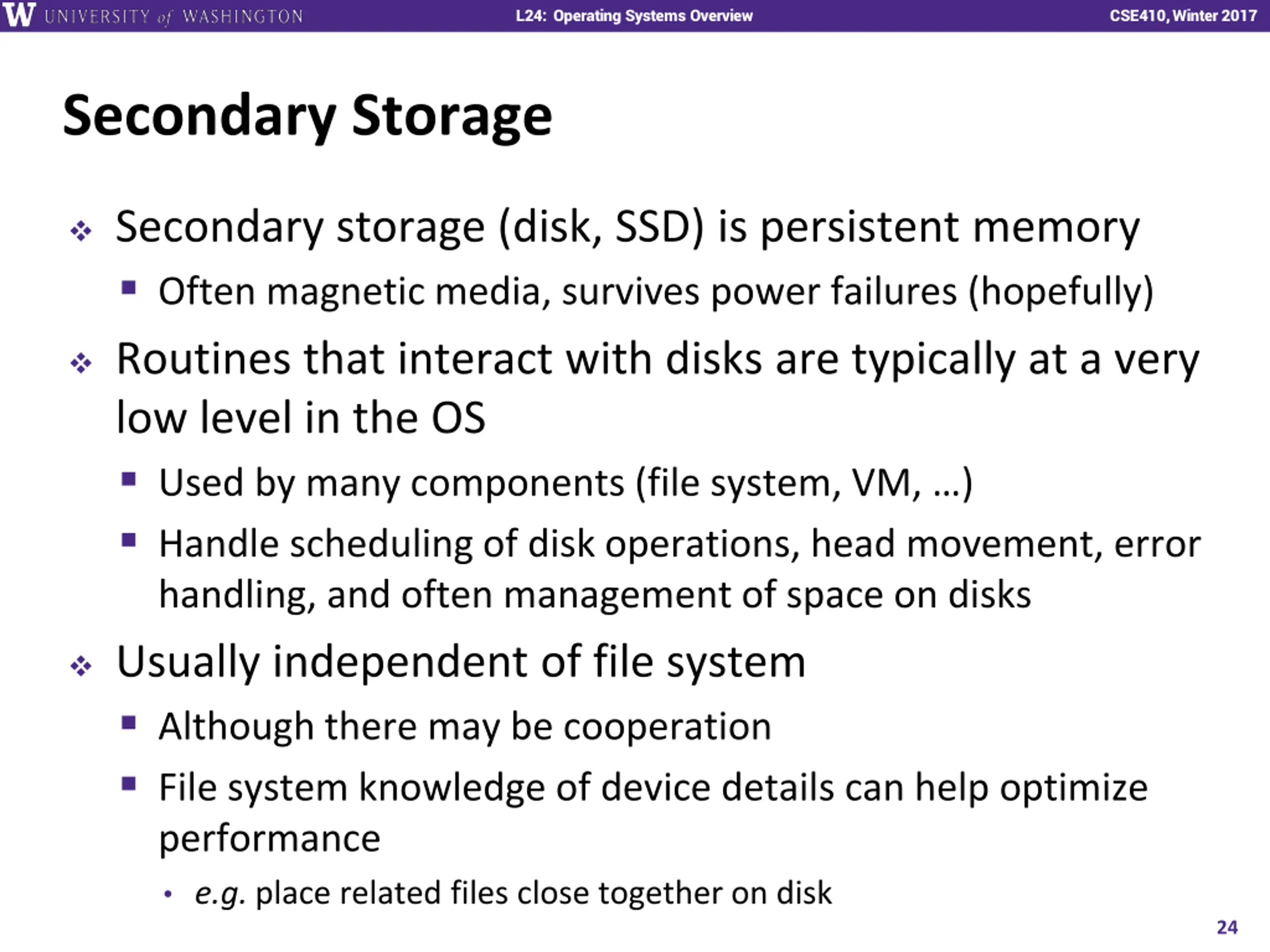L01: Intro, Combinational Logic L24: Operating Systems Overview CSE369, Autumn 2016 CSE410, Winter 2017 Secondary Storage Secondary storage (disk, SSD) is persistent memory Often magnetic media, survives power failures (hopefully) Routines that interact with disks are typically at a very low level in the OS Used by many components (file system, VM, ) Handle scheduling of disk operations, head movement, error handling, and often management of space on disks Usually independent of file system Although there may be cooperation File system knowledge of device details can help optimize performance e.g. place related files close together on disk 24