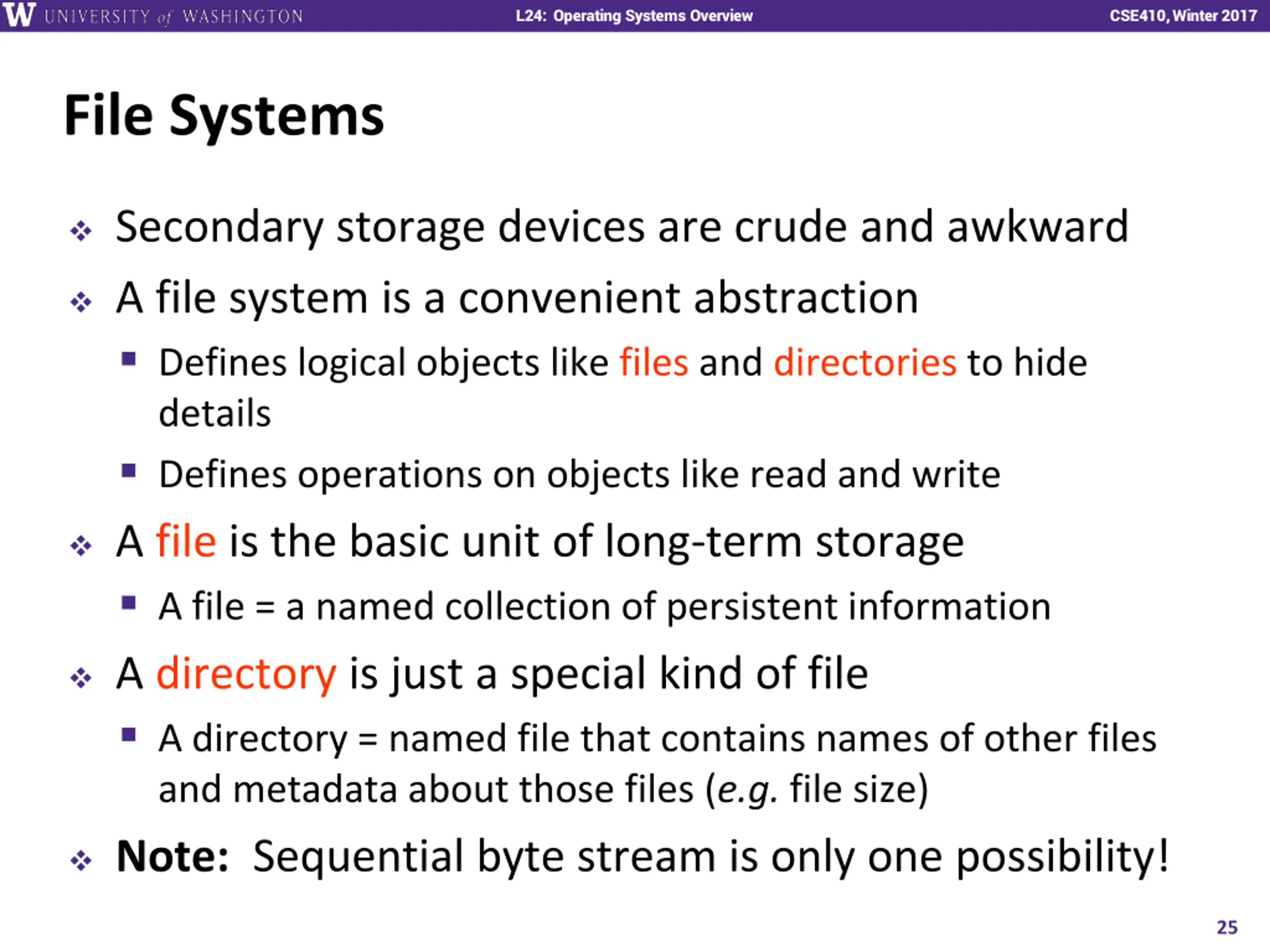 L01: Intro, Combinational Logic L24: Operating Systems Overview CSE369, Autumn 2016 CSE410, Winter 2017 File Systems Secondary storage devices are crude and awkward A file system is a convenient abstraction Defines logical objects like files and directories to hide details Defines operations on objects like read and write A file is the basic unit of long-term storage A file = a named collection of persistent information A directory is just a special kind of file A directory = named file that contains names of other files and metadata about those files (e.g. file size) Note: Sequential byte stream is only one possibility! 25