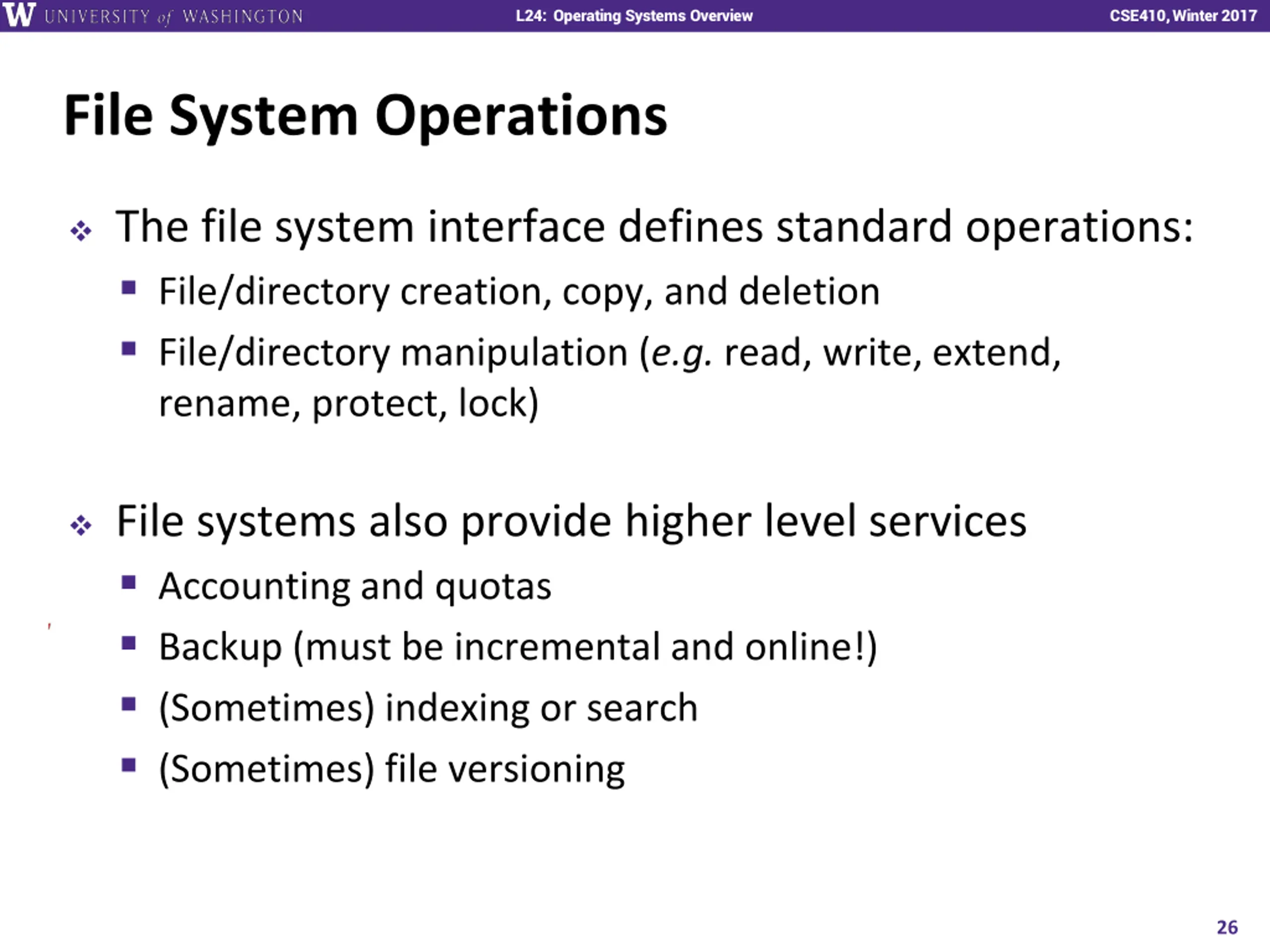 L01: Intro, Combinational Logic L24: Operating Systems Overview CSE369, Autumn 2016 CSE410, Winter 2017 File System Operations The file system interface defines standard operations: File/directory creation, copy, and deletion File/directory manipulation (e.g. read, write, extend, rename, protect, lock) File systems also provide higher level services Accounting and quotas Backup (must be incremental and online!) (Sometimes) indexing or search (Sometimes) file versioning 26